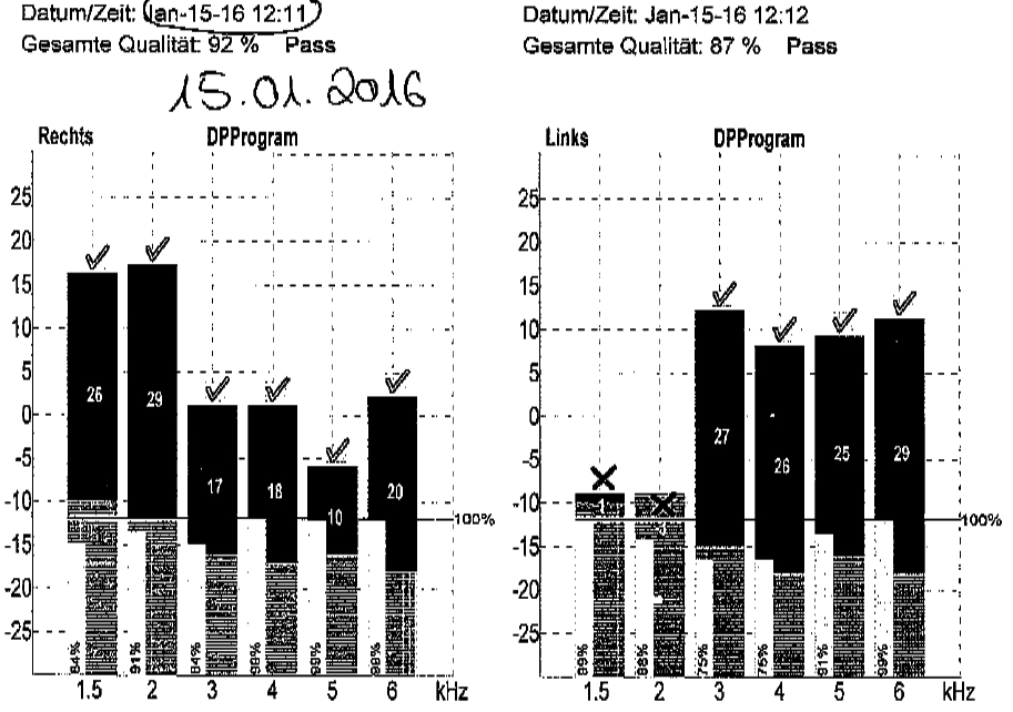 die DPOAE-Ergebnisse auf der linken Seite "passen zur Reintonaudiometrie des linken Ohres".