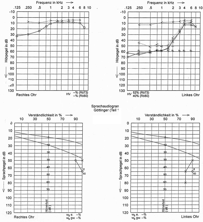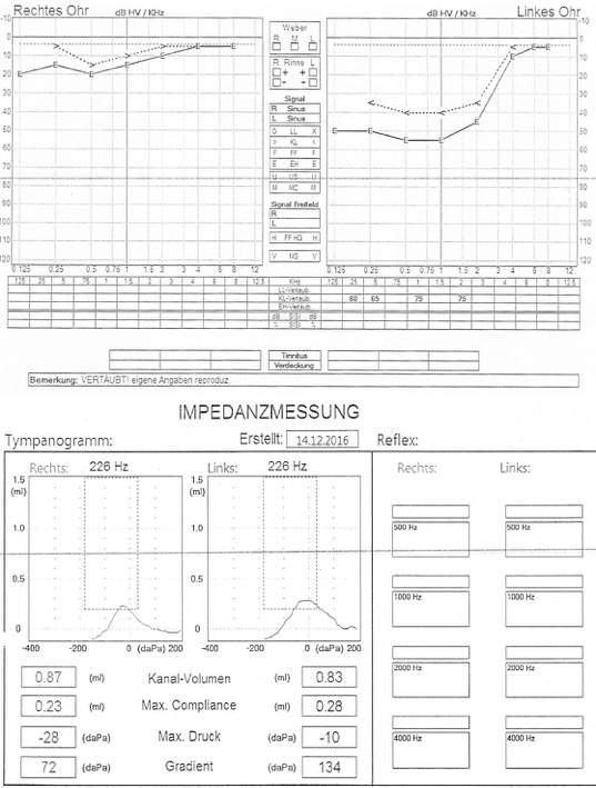 Eine Innenohrschwerhörigkeit läge LINKS vor. Die Schallleitung und eine Beteiligung des Mittelohrs soll keine Rolle spielen, sagte man uns, nachdem folgende Untersuchungen gemacht worden waren:
