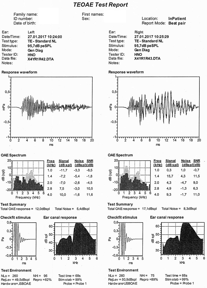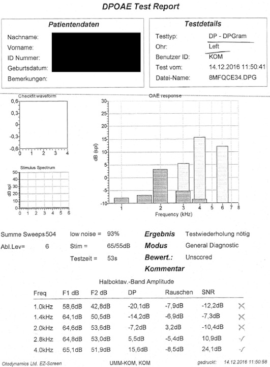 Auffällig ist, dass die DPOAE-Ergebnisse für das linke Ohr als unauffällig eingestuft werden (bis auf die bei 1 kHz).