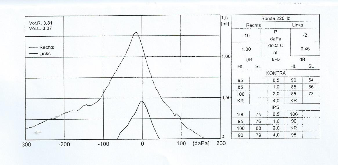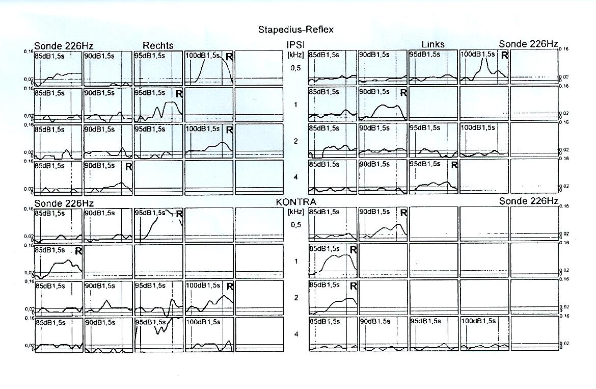 Von der CERA habe ich keine Unterlagen erhalten.Im Bericht steht nur,dass sie bei 45 dB lag,1000 Hz und 2000 kHz bei 30 dB.Rechts auch 30 dB.Mir ist nur aufgefallen in Hamburg,dass die Tymp. seltsam aussieht.Die obere Kurve scheint die rechte zu sein und die untere die linke.Auch die Stapediusreflexe sind beidseits kontra nicht ausgelöst worden bei 4 kHz.Liegt zur Ansicht mal bei.Beim Lesen über eine Funktionsstörung der Nervenzellen zusammen mit ausbleiben der Welle I,bin ich auch bei einer Synchronisationsstörung der Spiralganglierzellen hängen geblieben.Mal abwarten,was genau Hamburg in seinen Bericht schreibt.