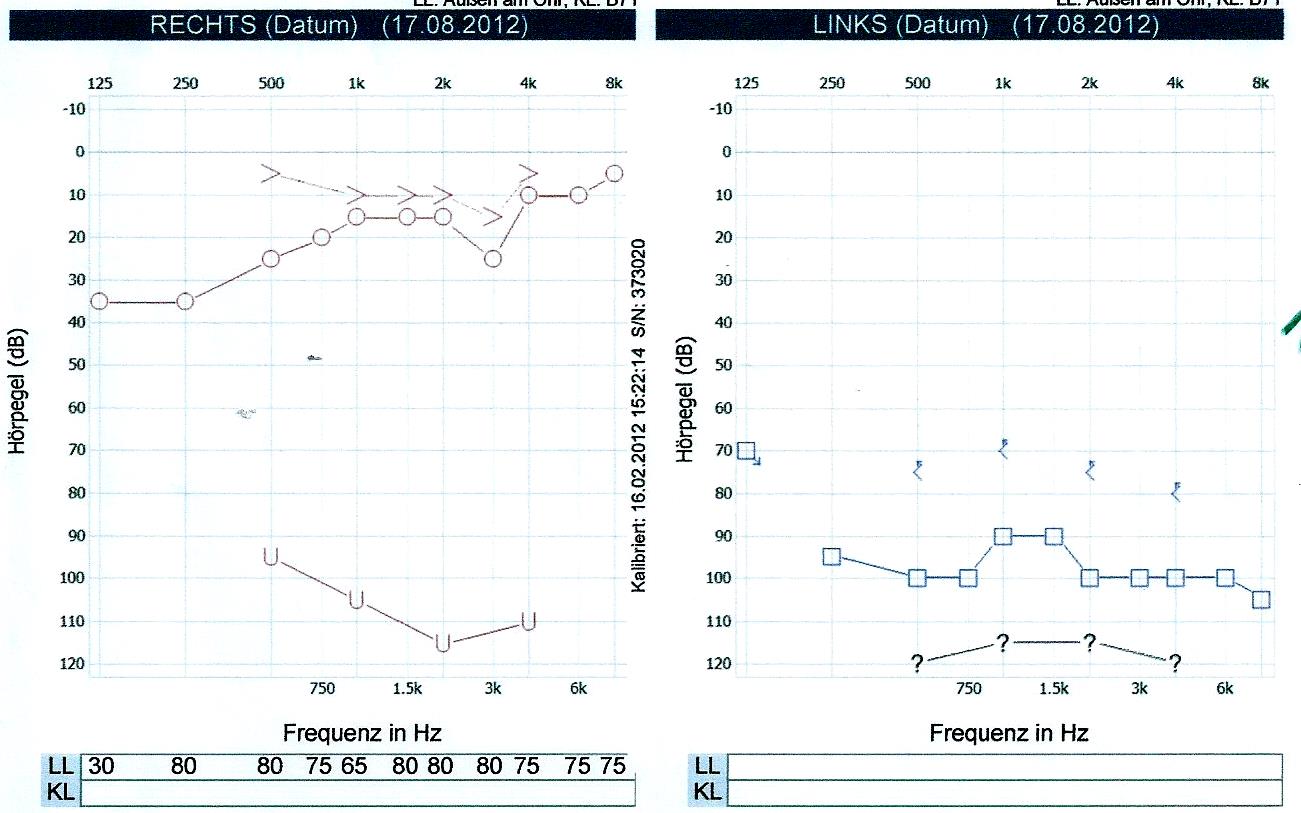 Das Audiogramm,was vorab gemacht wurde,war doch das,was in Hannover ohne Vertäubung und unter Druck gemacht wurde.BERA und CERA passten dazu!Ich stelle das noch mal mit rein zur Ansicht.Das Audiogramm von der MHH verstehe ich nach wie vor nicht.Nur die Knochenleitung wurde vertäubt und das mit 75-80 dB?Rechts existiert gar keine Knochenleitung.Dann passt meiner Meinung das Sprachaudio überhaupt nicht dazu.Komischerweise wurde dort mit 55 dB bei den Wörtern vertäubt.Vom Akustiker gibt es ein Audio,was 2 Wochen vorab gemacht wurde.Da wurde rechts mit 65-80 dB die Luftleitung vertäubt.Messungen danach habe ich erst wieder vom Akustiker im Oktober 2012.Während dieser Zeit schwankte das Gehör noch.
