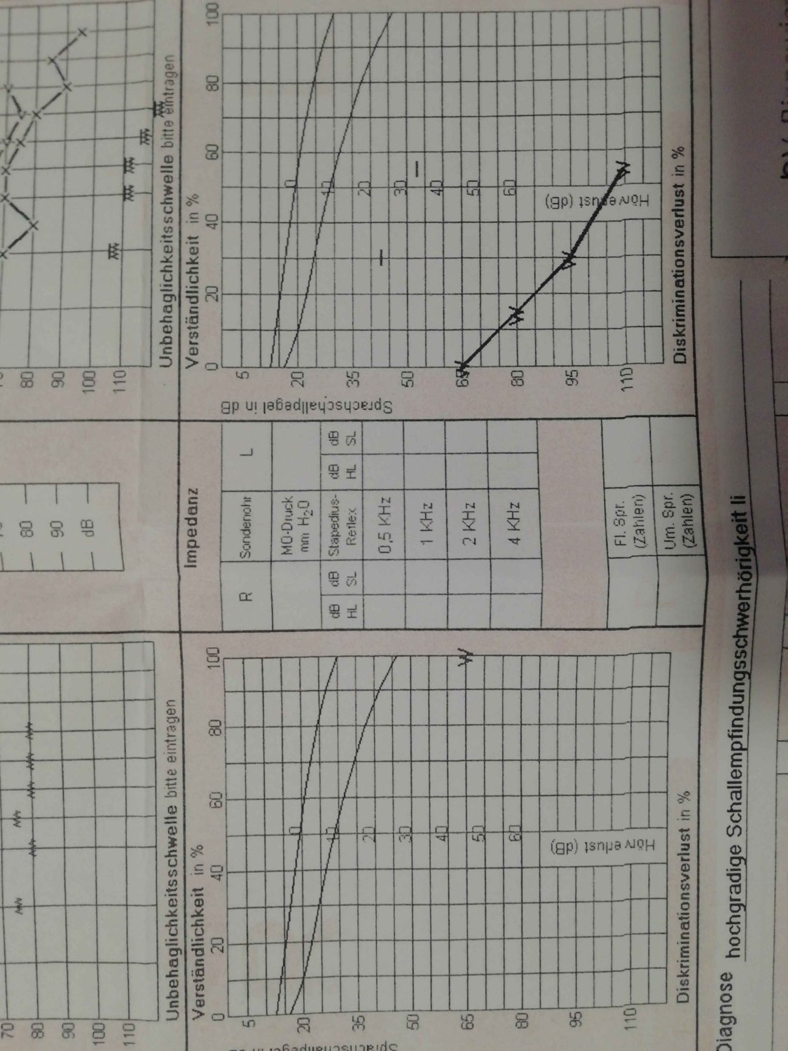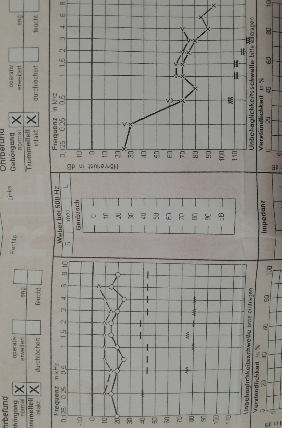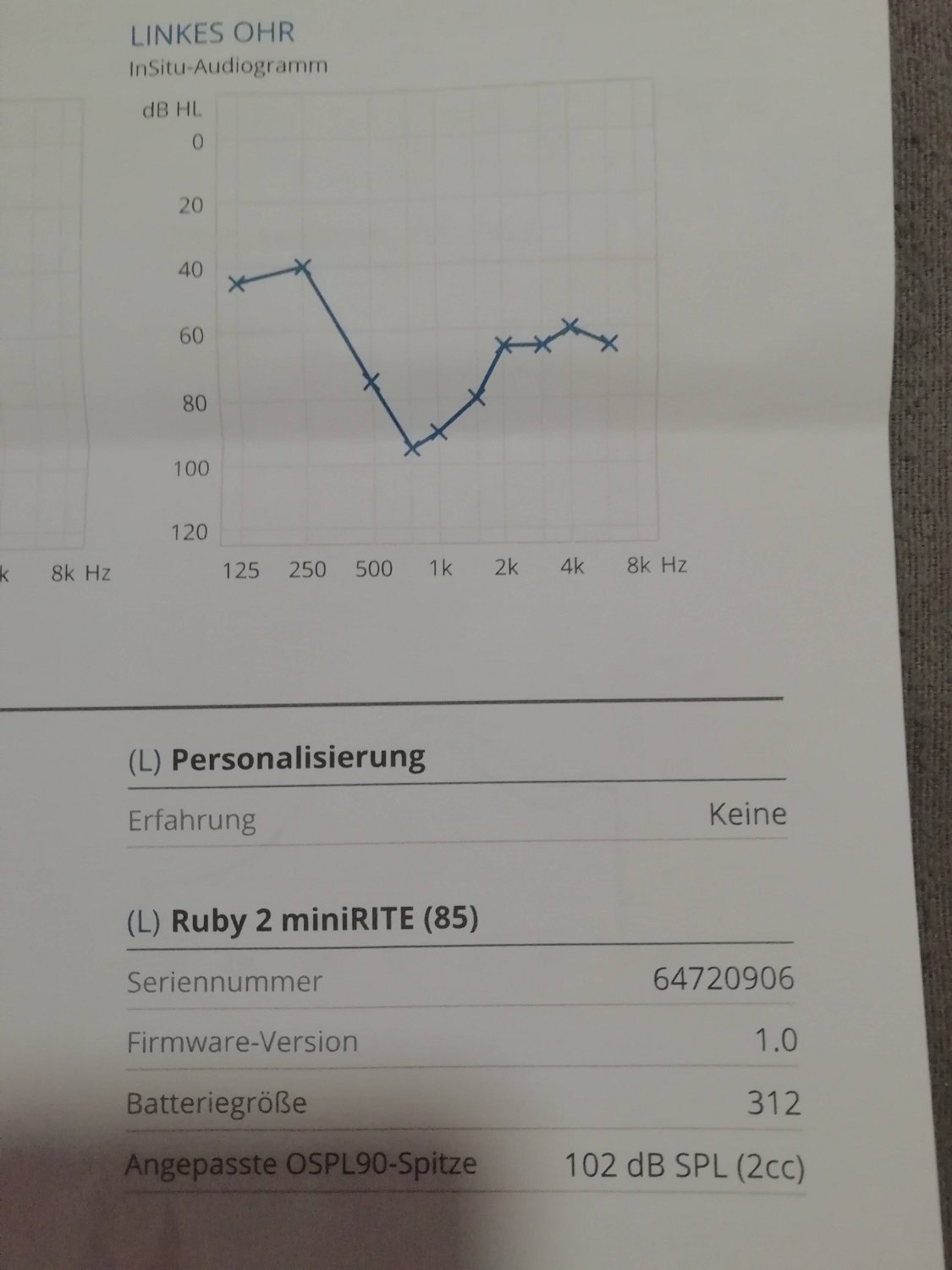 Heute war ich nun da und bekam das Oticon Ruby 2 hinters Ohr. Tja, was soll ich sagen, ich habe das Gefühl es ist genau so wie beim letzten Mal. Es macht keinen Unterschied, ob mit oder ohne, es gibt kein besseres Verstehen nur lauteres scheppern. Das konnte sie weitestgehend abstellen, aber mehr hören tu ich immer noch nicht. Sie erklärte mir dann, dass ich wohl gerade beim Sprachverstehen so schlecht hören würde, dass da mit einem Hörgerät eh nicht viel mehr geht, aber ich müsste mich ja auch erst daran gewöhnen. Die Töne die sie mir auf das Hörgerät eingespielt hat (die selben wie beim Audiogramm) hätte ich ja auch gehört.