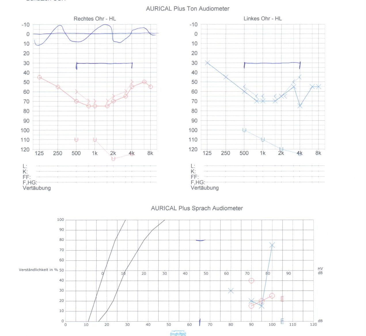 Zwischenzeitlich haben wir ein wenig rumexperimentiert. Der Akustiker hat bei eingesetzten Ex Hörern meine Ohren