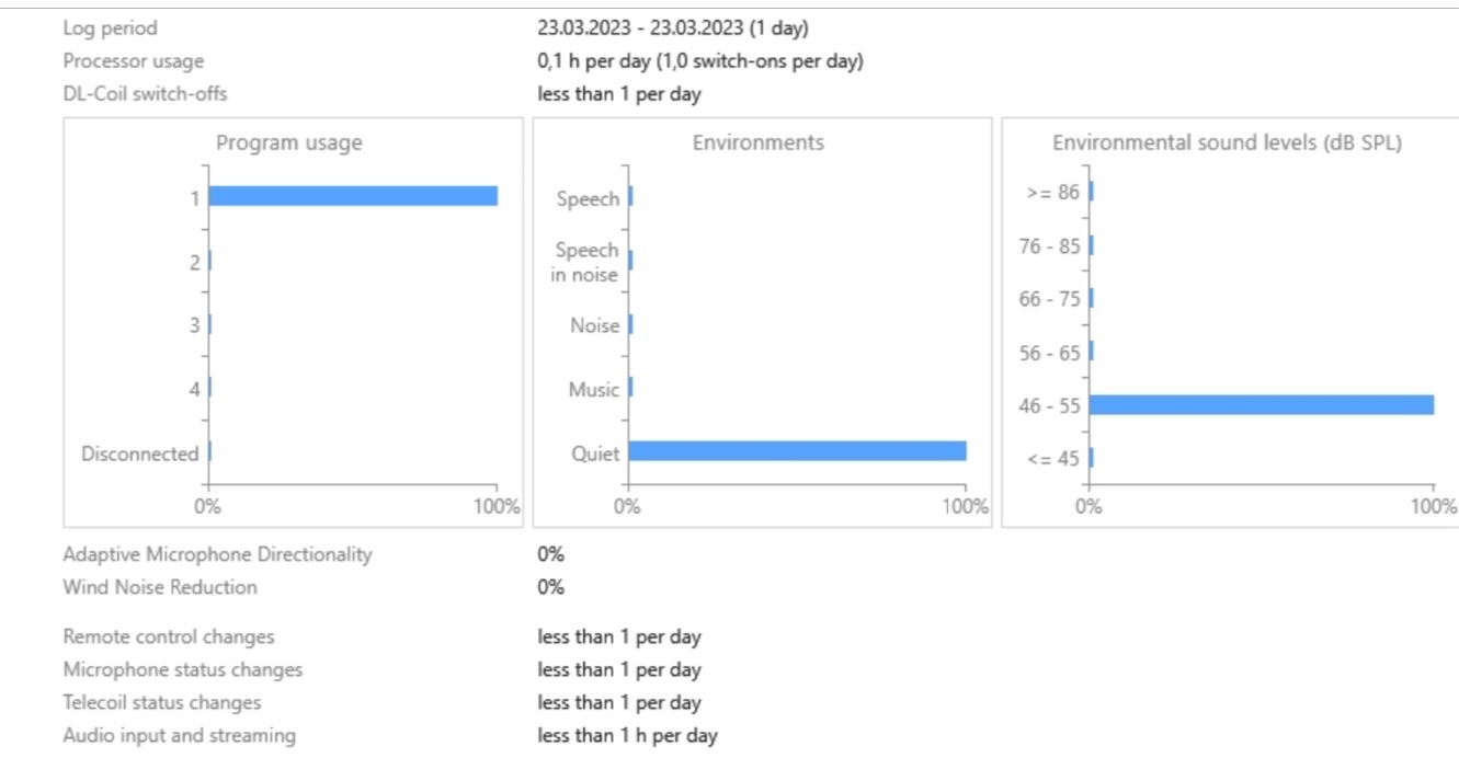 Das folgende Bild zeigt, was meine Hörsysteme mindestens aufzeichnen. Da der Audiologe während der Sitzung die Daten zurückgesetzt hat, sind nur Aufzeichnungen von 0,1h enthalten. Getrennt nach hörumgebung und Programm, wann Streaming stattfindet oder ich im Restaurant bin. Das Bild zeigt nur die grafische Zusammenfassung. Die Rohdaten sind weitaus detaillierter. Tu bitte nicht so, dass da keine Rückschlüsse gezogen werden können.