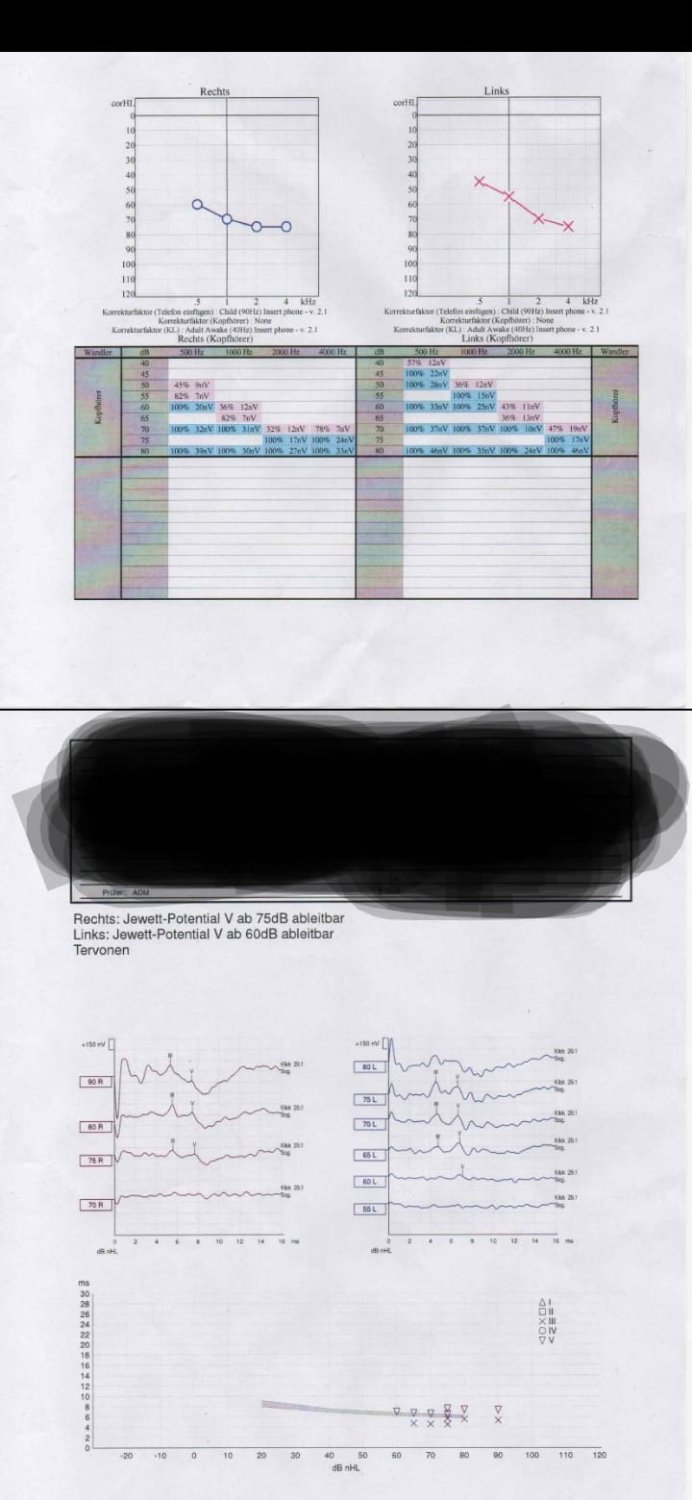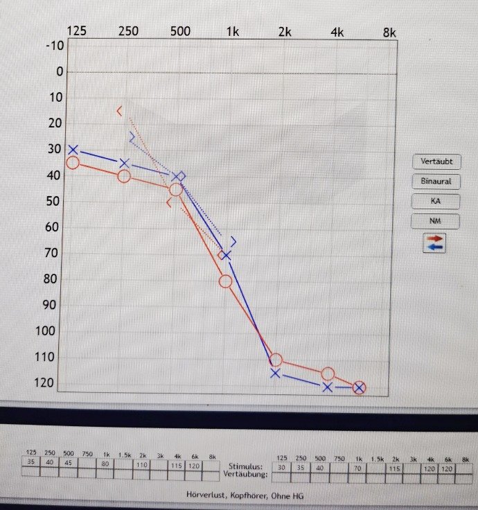 Das linke Ohr hat sich von 90db auf 60db verbessert. Das rechte Ohr von 80 auf 75db. Lt. HNO Ärzten war das erwartbar, ist aber egal.