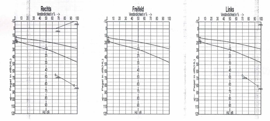 Die Diagramme unten sind das Sprachaudiogramm. Da ist die Verstehquote für einsilbige Wörter rechts bzw. links eingezeichnet. Bei 65 dB Sprachlautstärke hast du 70% verstanden, bei 80 dB 95%.