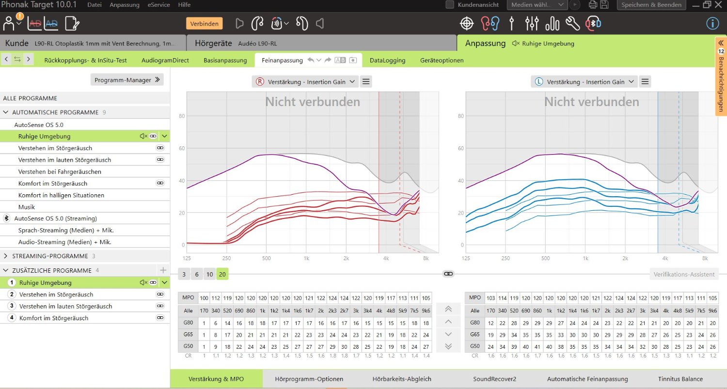 Ok, ich habe mich da noch nicht ran gewagt. Habe jetzt einen Link gelöscht (Verstehen im lauten Störgeräusch), und ein neues manuelles Programm, erzeugt und wie empfohlen das Programm (Verstehen im lauten Störgeräusch) G50-3dB G65+3dB G80+6dB manuell eingestellt. Jetzt sind die Kurven fast deckungsgleich. CR ist durchgängig zwischen 1 und 1.1. Mal sehen, ob das bei mir so funktioniert. Habe Ende des Monats einen Härtetest. Schön wäre es eine akzeptable Lösung zu finden und das langfristig im Automatikprogramm zu ändern. Ich habe keinerlei sonstige Berechnungen oder Umrechnungen durch Target machen lassen. Ich hoffe, das war alles bisher richtig. Erst mal vielen Dank an Dani! und Ohrenklempner. Werde erst mal testen und berichten.