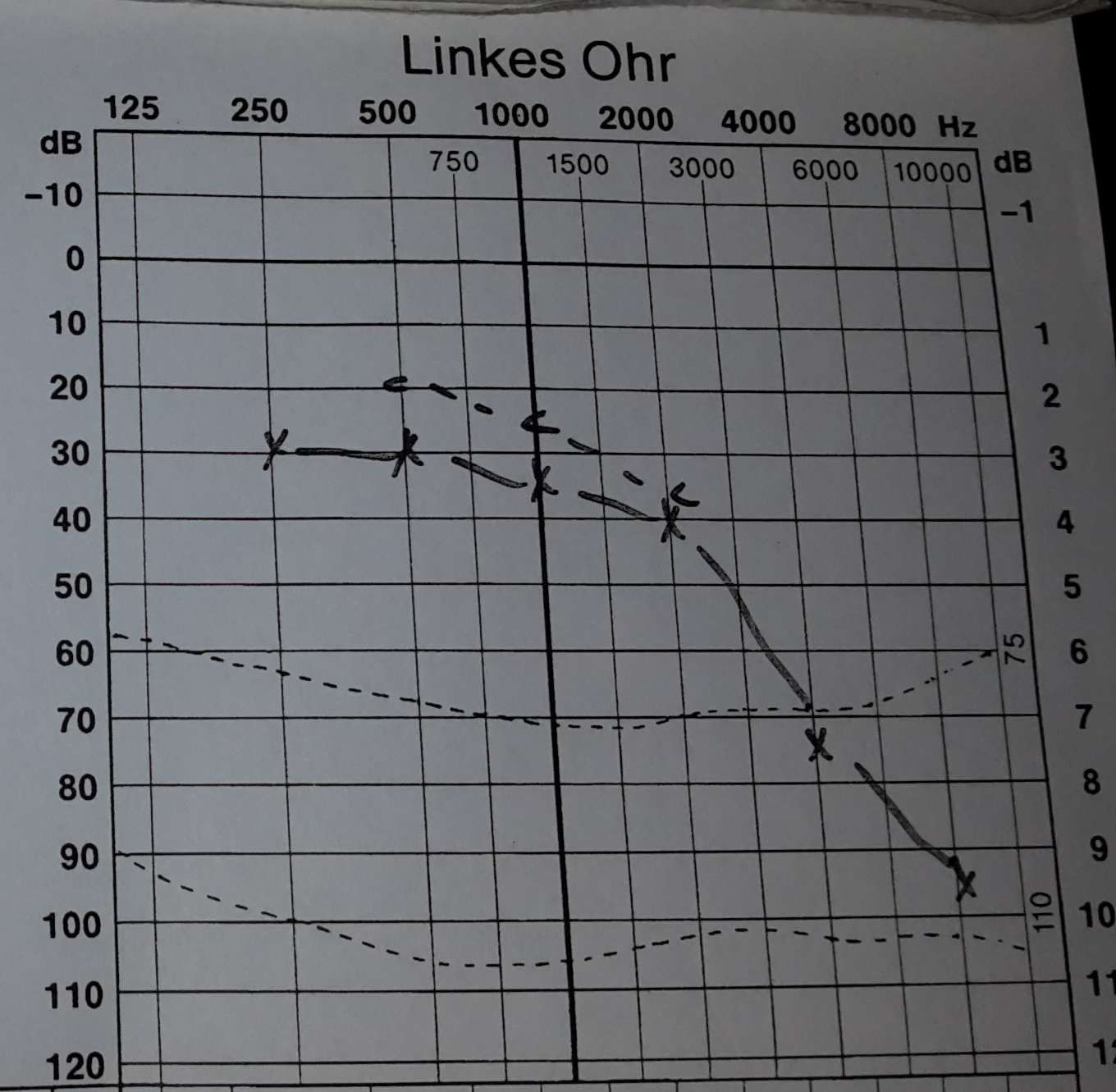 linkes Ohr, was im Februar 2013 noch beim sprachlichen verstehn bei 80 % lag, läge nun bei 65% nur noch . Ich war geschockt! Weil ich weder ne Mittelohrendzündung noch Hörstürze hatte.