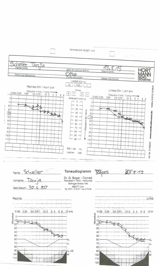 Könnte mir jemand behilflich sein und mir die Hörtests genauer erklären? die zwei einfachen vom 19/20.8. waren bei den HNO Ärzten und der Andere in der HNO Uniklinik. Leider war da mit erklärungen nicht viel, sondern nur das mit Cortison versucht wird das Innenohr zu entlasten ( und den Tinnitus zu verbessern) , sollte dies nicht klappen und eine weitere verschlechterung eintreten würde es allerdings auh HGś zulaufen. :-(