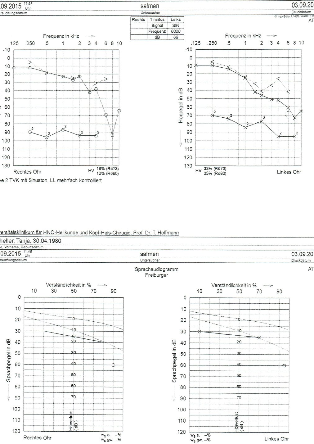Gemäss aktuellstem Hörtest hat sich der Schallempfindungsanteil etwas gebessert, wobei jedoch zusätzlich eine Schallleitungskomponente im Hochtonbereich besteht. Leider gibt es keine Möglichkeit, diese mit alternativen Testmethoden zu bestätigen.