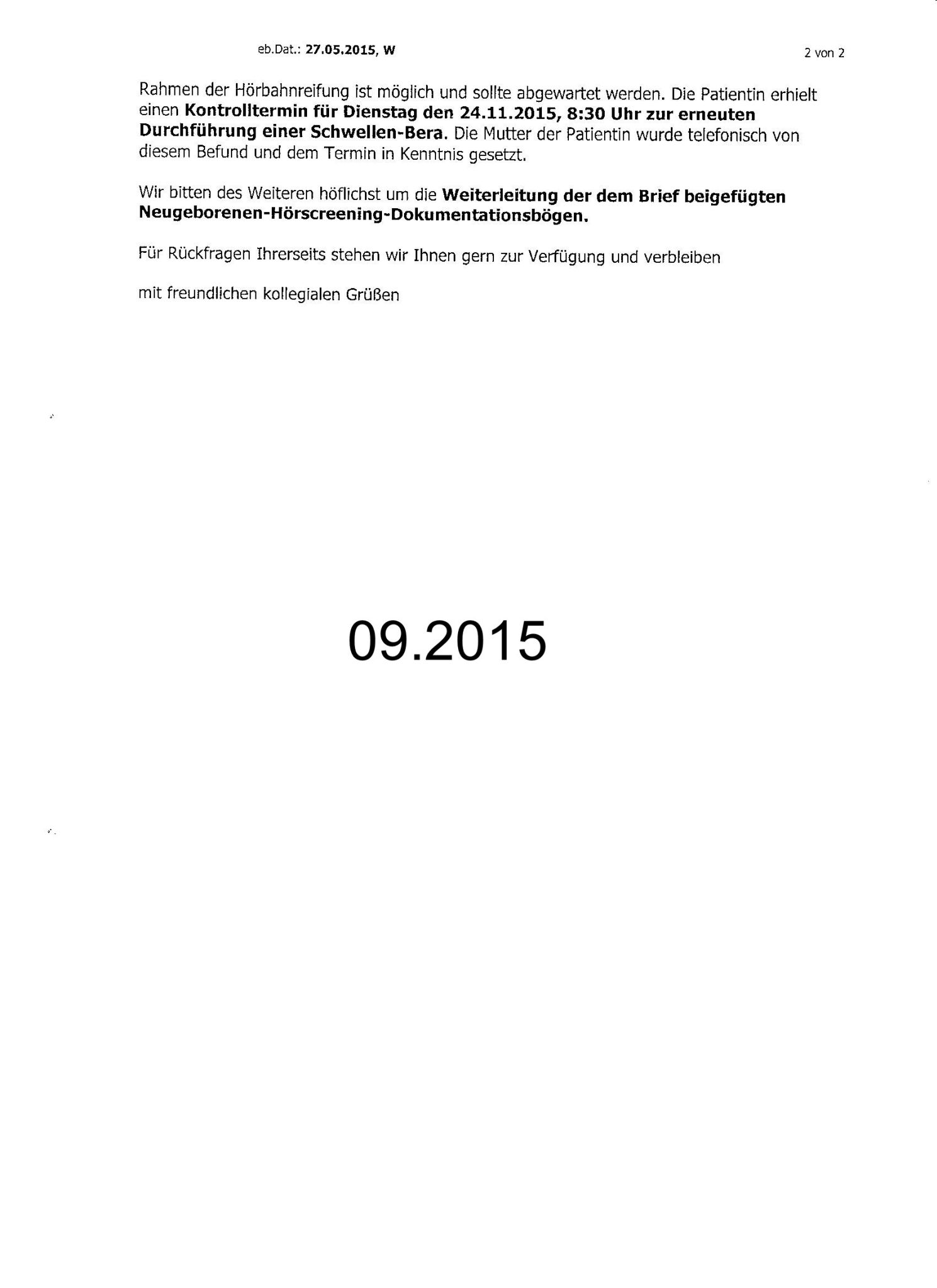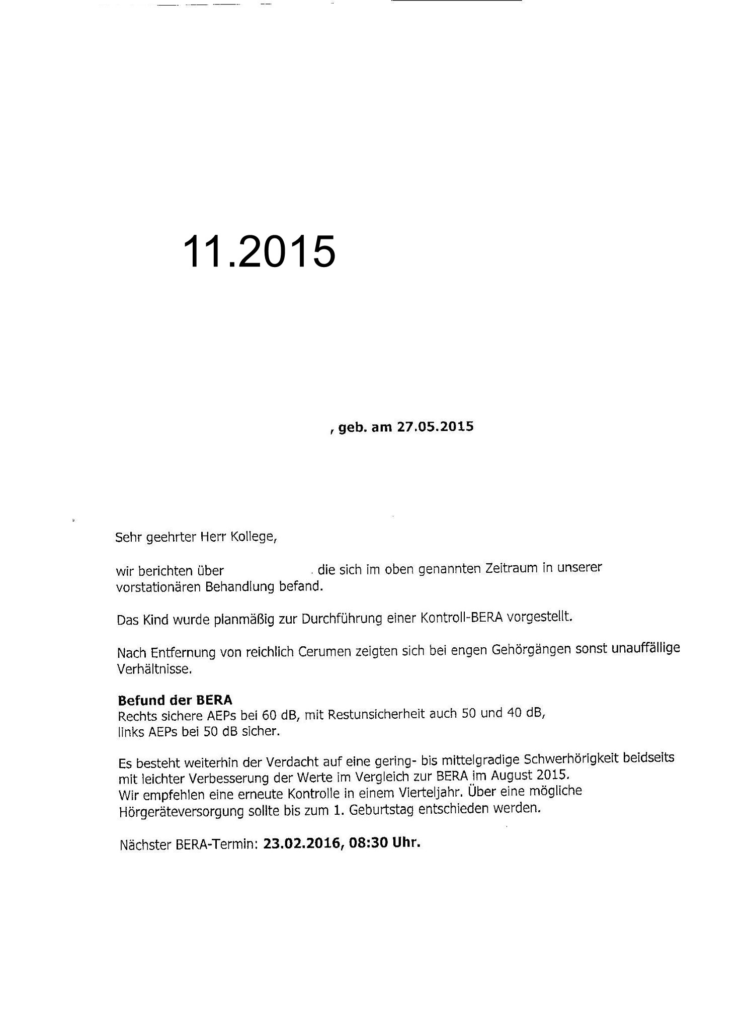 Daraufhin Kontrolle im November. Befund: reichlich Cerumen und enge Gehörgänge sonst unauffällig.Bera: sichere AEP´s bei 60 dB, mit Unsicherheit auch 50 und 40 dB, links AEP´s bei 50 dB sicher.