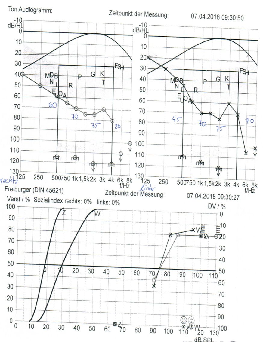 Was mich wundert: Um den Hörverlust via Sprachverstehen berechnen zu können benötigt man doch die Werte bei 100, 80 und 60 dB SPL? Warum wurde dass denn bei keiner der Messungen eingezeichnet - gerade der HNO wusste ja, dass die Messung für das Sozialamt benötigt wird.