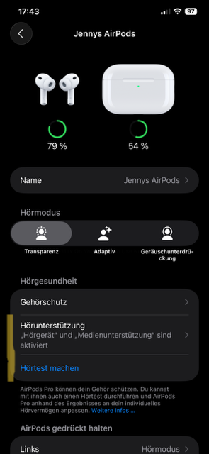 Wenn du die AirPods aber doch erstmal als Hörgerät nutzen möchtest (macht ja scheinbar auch der ein oder andere hier), dann trage lieber die AirPods durchgehend und kommuniziere das irgendwie bei der Arbeit. Wenn das für dich praktikabel ist, könntest du das Hörgerätethema ja auch nochmal aufschieben.