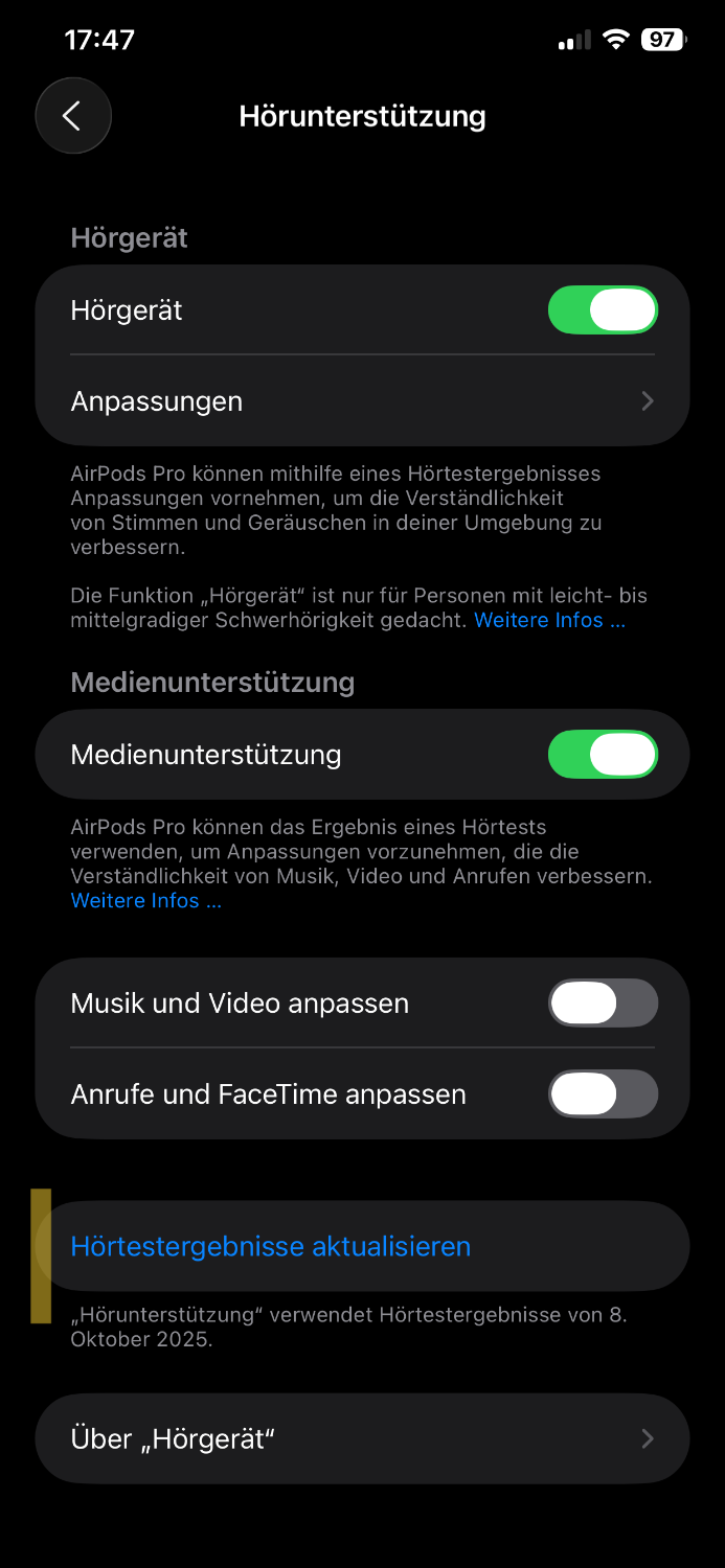 Entweder auf den Unterpunkt "Hörtest machen" drücken und den Apple Hörtest machen oder auf den Unterpunkt "Hörunterstützung" drücken. Da gibt es bei mir den Unterpunkt "Hörtestergebnisse aktualisieren".