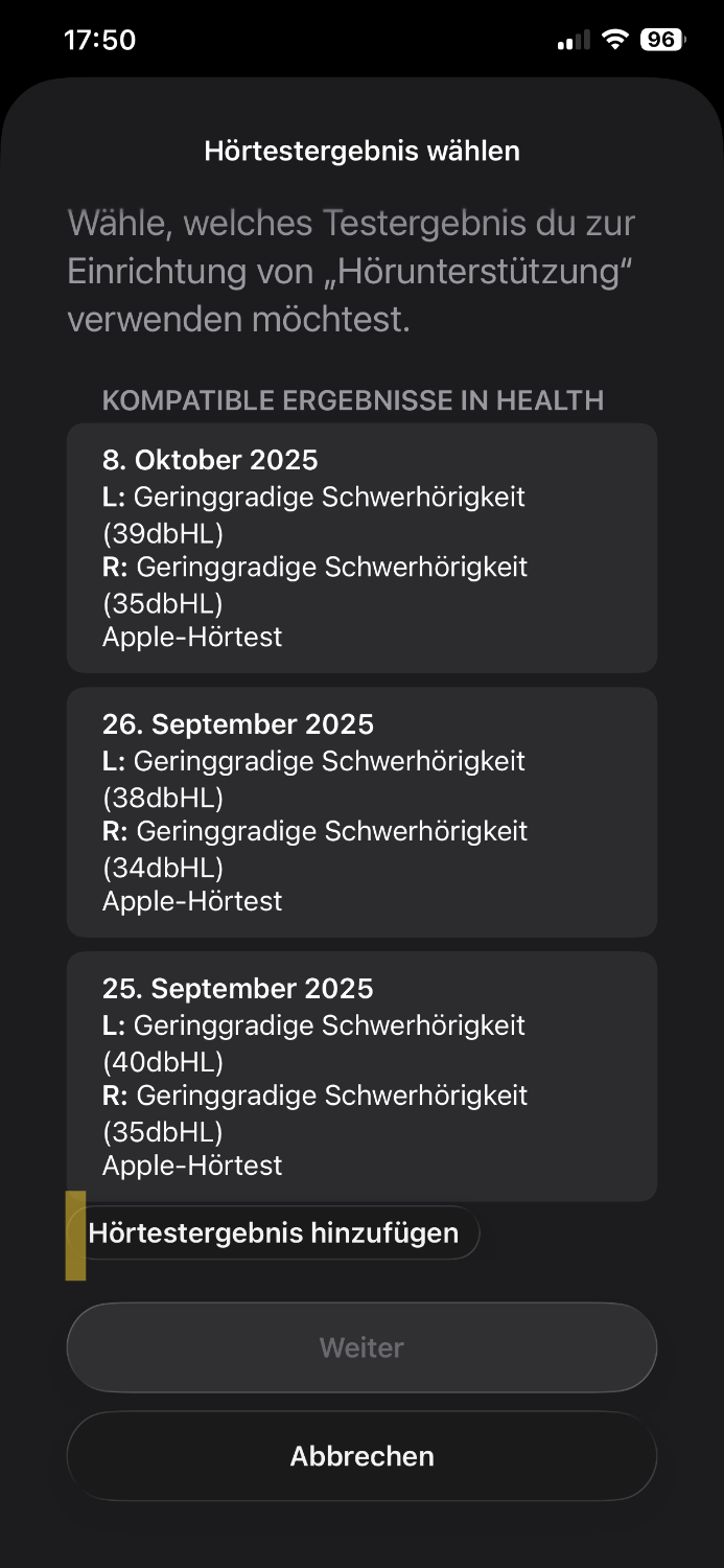 Dann gibt es dort bei mir einen Bereich "Hörgesundheit". Entweder auf den Unterpunkt "Hörtest machen" drücken und den Apple Hörtest machen oder auf den Unterpunkt "Hörunterstützung" drücken. Da gibt es bei mir den Unterpunkt "Hörtestergebnisse aktualisieren". Dort kann man "Hörtestergebnisse hinzufügen".