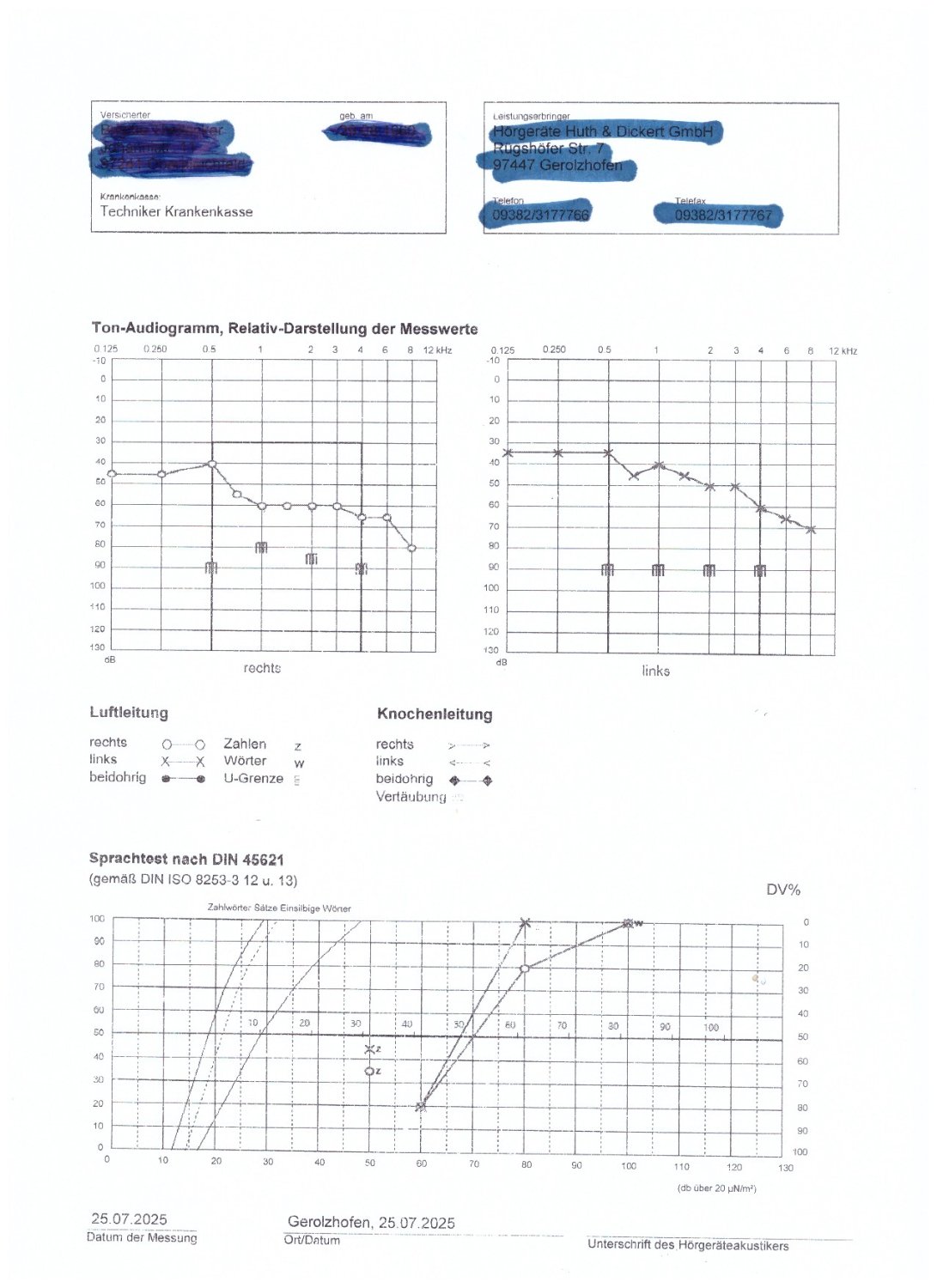 Mit dem unteren Audiogramm für Sprache benötigst du für Tabelle A das kumulierte Wortverstehen von einsilbigen Wörtern (Freiburger Sprachtest) bei 60, 80 und 100dB sowie den Schnittpunkt mit der 50% Schwelle für die mehrsilbigen Wörter (Zahlen).