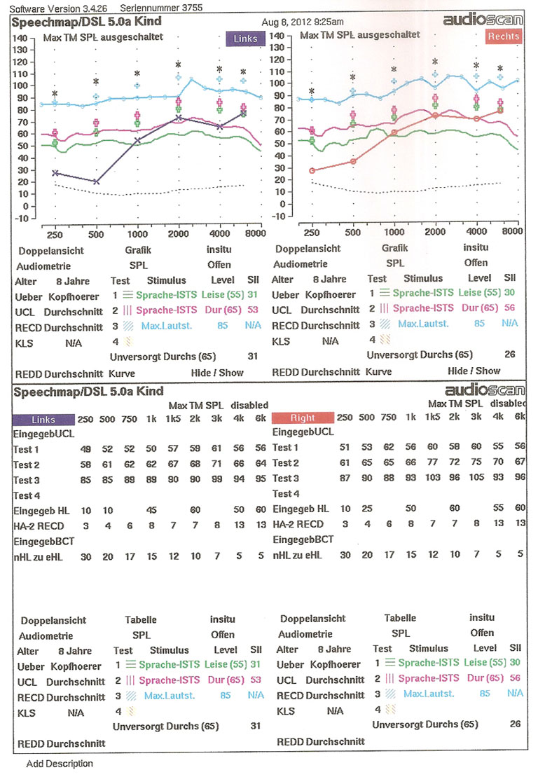 Audiologischer Befund: Tonschwellenaudiometrisch bestand nach eigenen reproduzierbaren Angaben bds. eine mittelgradige Schwerhörigkeit (0,5/1/2/4/8 kHz 25/50/60/55/75 dB, links: 10/45/60/55/65 dB). Die Tympanogramme waren bds. gipfelbildend (rechts im Unterdruckbereich - 108 daPa). Die Stapediusreflexe waren bds. jeweils ipsi- als auch contralateral bei 0,5/1/2/4 kHz mit 90 bis max. 105 dB reproduzierbar auslösbar. Im Freifeldsprachaudiogramm (Freiburger Einsilber) verstand sie bei 55/65/80 dB 25/35/40 % der Einsilber sowie mit den Phonak Nios Micro III bds. 15/45/65 % der Einsilber. Bei der getrenntohrigen Messung (Freiburger Zahlen) verstand sie bei 55/60 dB rechts 20/50 % sowie links bei 45/50 dB 40/80 %. Die TEOAE waren links bis 2 kHz reproduzierbar nachweisbar, rechts nicht. Die DPOAE waren links nicht nachweisbar.