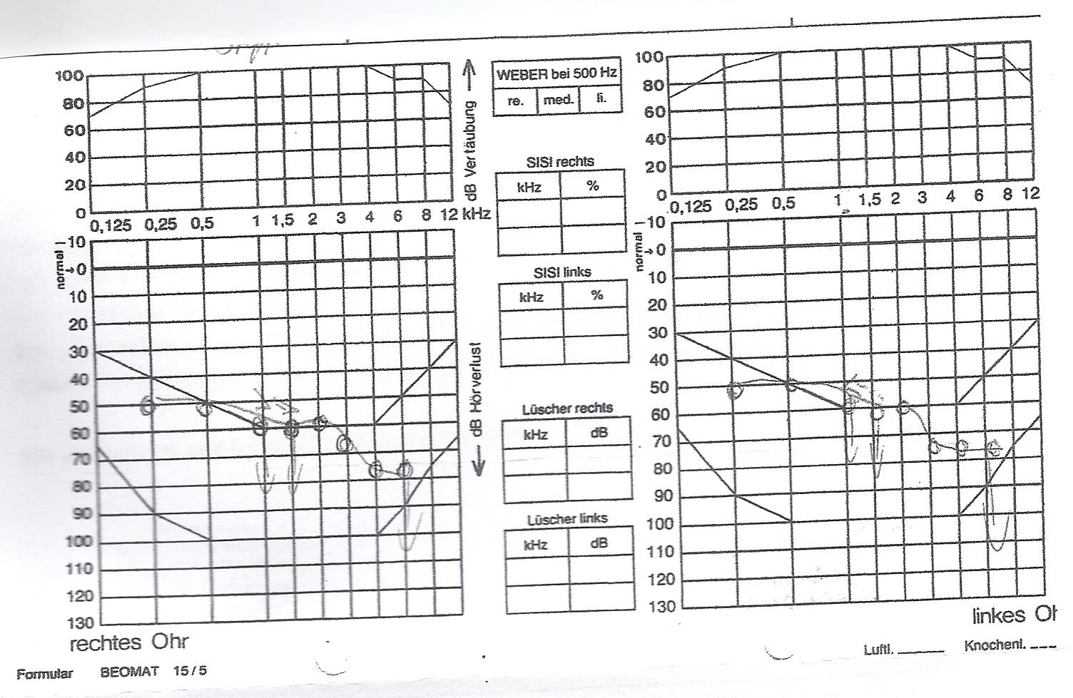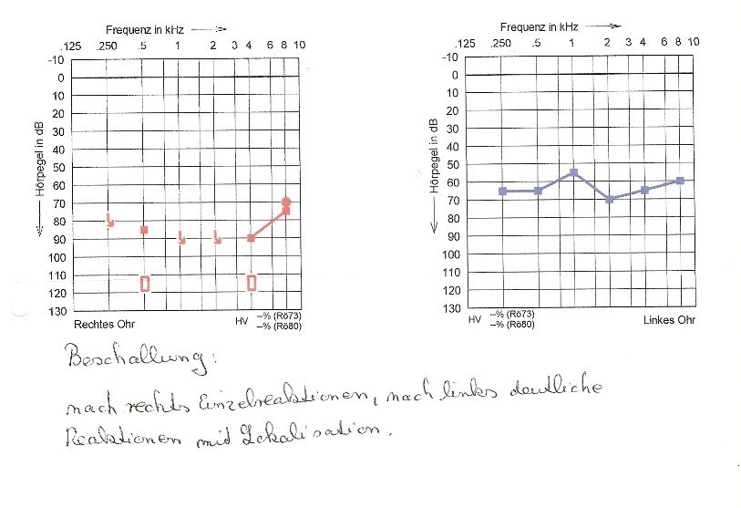 johanna ist von geburt an schwerhörig. Links: hochgradig schwerhörig(65 db) und rechts "medizinisch" taub(95db)