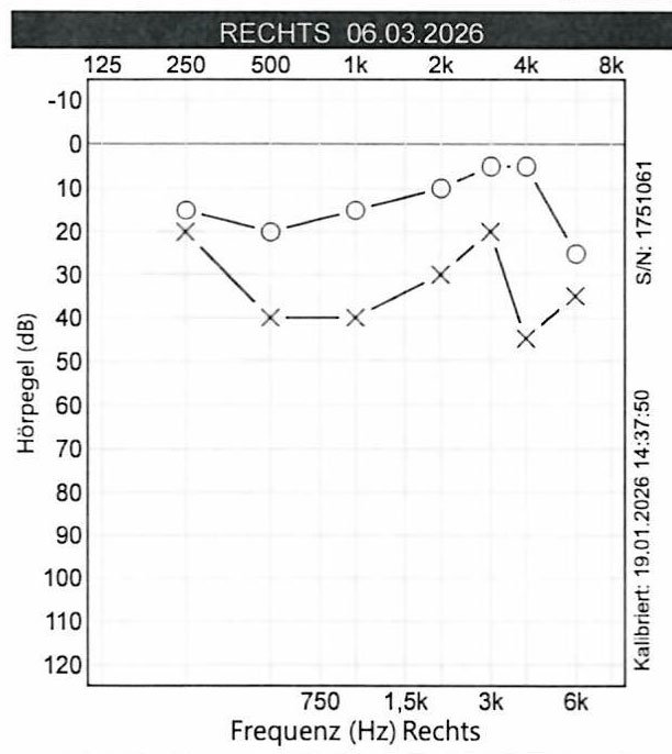 Heute habe ich das Audiogramm erhalten. Zur besseren Vergleichbarkeit habe ich in Photoshop die linke Kurve in das rechte Diagramm hinein kopiert. Was meint ihr? Schlimmer geht immer, richtig?