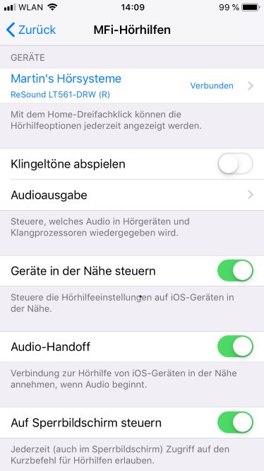 BgmSon hat geschrieben:Am Donnerstag, 25.10., hatte ich einen Termin bei meinem Akustiker. Er löste das Problem, in dem er bei Resound angerufen hat. Eine kleine Einstellung bei meinem IPhone musste vorgenommen werden.... kleine Ursache.... große Wirkung. Jetzt kommen die Telefonate im Ohr an und ich kann übers Mikro am Clip telefonieren.