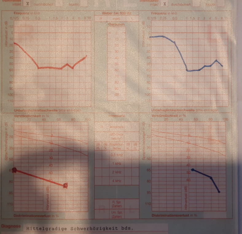 Leider scheint meine Innenohrschwerhörigkeit erblich bedingt und meine Hörfähigkeit sackt immer wieder sprunghaft, aber leider dauerhaft ab. Nach dem letzten Verschlechterung im November 2019 riet mir mein HNO, erneut einen Änderungsantrag beim Versorgungsamt zu stellen, der jetzt vor kurzem bearbeitet wurde. Auf der Grundlage der eingereichten "Ohrkurven Zweitantrag Arzt" und den zusätzlichen "Ohrkurven Zweitantrag Akustiker" wurde mir wieder ein GdB von 40 zugeordnet. Mein Arzt war sich sicher, dass diesmal ein GdB 50 zugeordnet würde, aber anscheinend scheinen viele Ärzte ja nicht so viel Ahnung davon zu haben. Im GdB-Rechner ergibt sich ja mit den alten Werten ein mittelschwere Schwerhörigkeit, mit den neuen definitiv eine hochgradige Schwerhörigkeit...