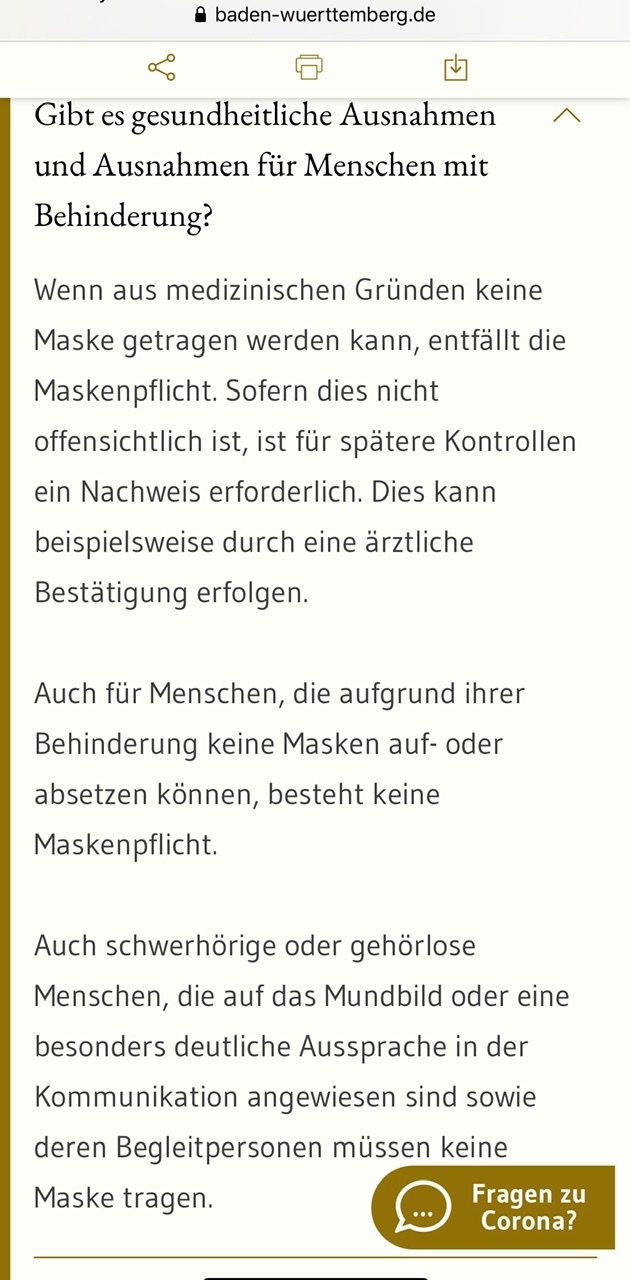 Ausgenommen bleibt auch, für wen das Tragen einer Maske wegen einer Behinderung oder aus medizinischen Gründen - etwa wegen Asthma - unzumutbar ist. Sofern die Gründe nicht offensichtlich sind, ist ein Nachweis wie etwa eine ärztliche Bestätigung für etwaige Kontrollen erforderlich.