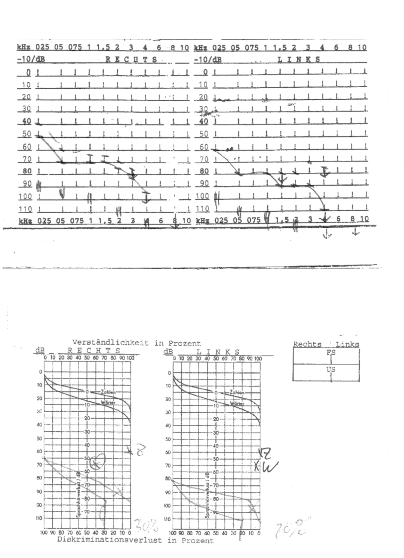 Allerdings macht mich dein Sprachaudiogramm stutzig. Angeblich ein Diskriminationsverlust von gerade mal 30 bzw. 20%. Warum dort außerdem 2 Linien sind, kann ich mir nicht erklären. Ist das Sprachverstehen mal mit und mal ohne Hörgerät getestet worden?