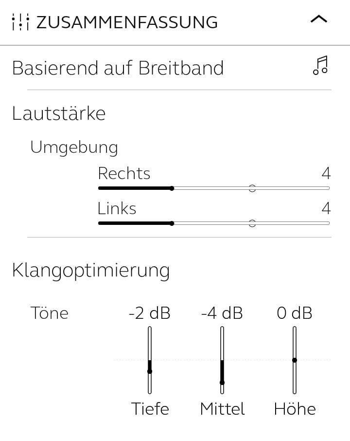 Habe das Mic mal auf Stufe 4 abgesenkt, also die HGs in der Summe leiser gemacht, teste ob Stufe 6 nicht doch besser wäre und habe die Mitten (wo viel Kauderwelsch, Rauschen usw drin ist) recht stark abgesenkt mit dem EQ und in den Höhen keine Änderung weiter gegeben, sollte also die Stärke meiner Hörkurve verwendet werden. Die Automatiken sollten ja im Musik Programm alle soweit eigentlich abgeschaltet sein, habe aber das Gefühl trotzdem eine Mic Fokusierung zu bemerken, die was verstellt. Dadurch wird alles mal so Mono und feine Klänge wie Uhren ticken oder Maus klicken verschwinden wieder. Wenn ich mich bewege oder Kopf drehe, kommen die Detail Klänge wieder, da was geschaltet hat in den HGs.