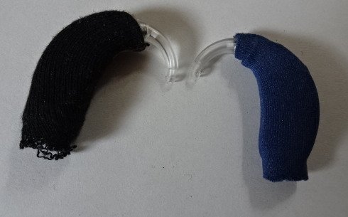 Foto von zwei Hörgeräten, die in Stoff eingenäht wurden
