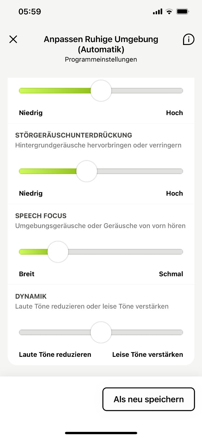Ich wollte damit ausdrücken, dass man solche Dinge einstellen kann. Was die unterschiedliche Einstellung bei der Geräuschunterdrückung bei Automatik und beim Streamen betrifft, hatte der Akustiker beim Anpassen vielleicht "vergessen".