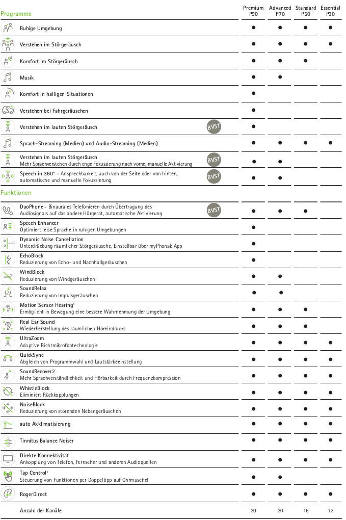 Du hast zwar die Marketinginfos schon gelesen, aber vielleicht kennst du diese Auflistung noch nicht? Ich fand sie bei der Entscheidung sehr hilfreich, da zB WindBlock mir sehr wichtig ist, er kommt aber erst in der Stufe 70 vor. Da habe ich lieber die Unitrons genommen (fast die gleiche Technik wie Phonak), da Unitron den Windblock schon bei der niedrigsten Technikstufe anbieten.