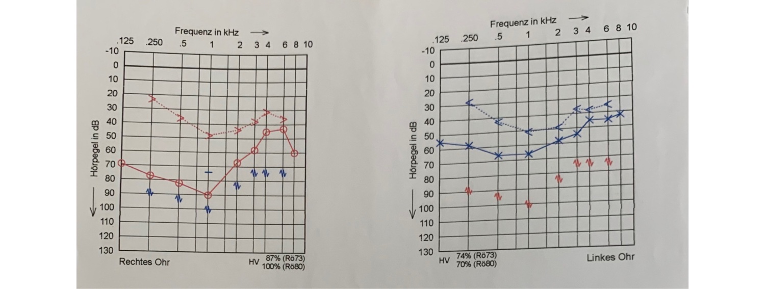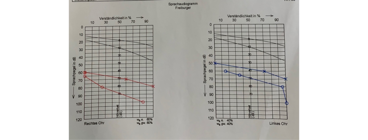 ABER: du verstehst erstaunlich viel! Wenn ich dein Tonaudiogramm sehe würde ich weniger erwarten. Oder das liegt daran dass dein linkes Ohr signifikant besser ist wie das rechte Ohr?
