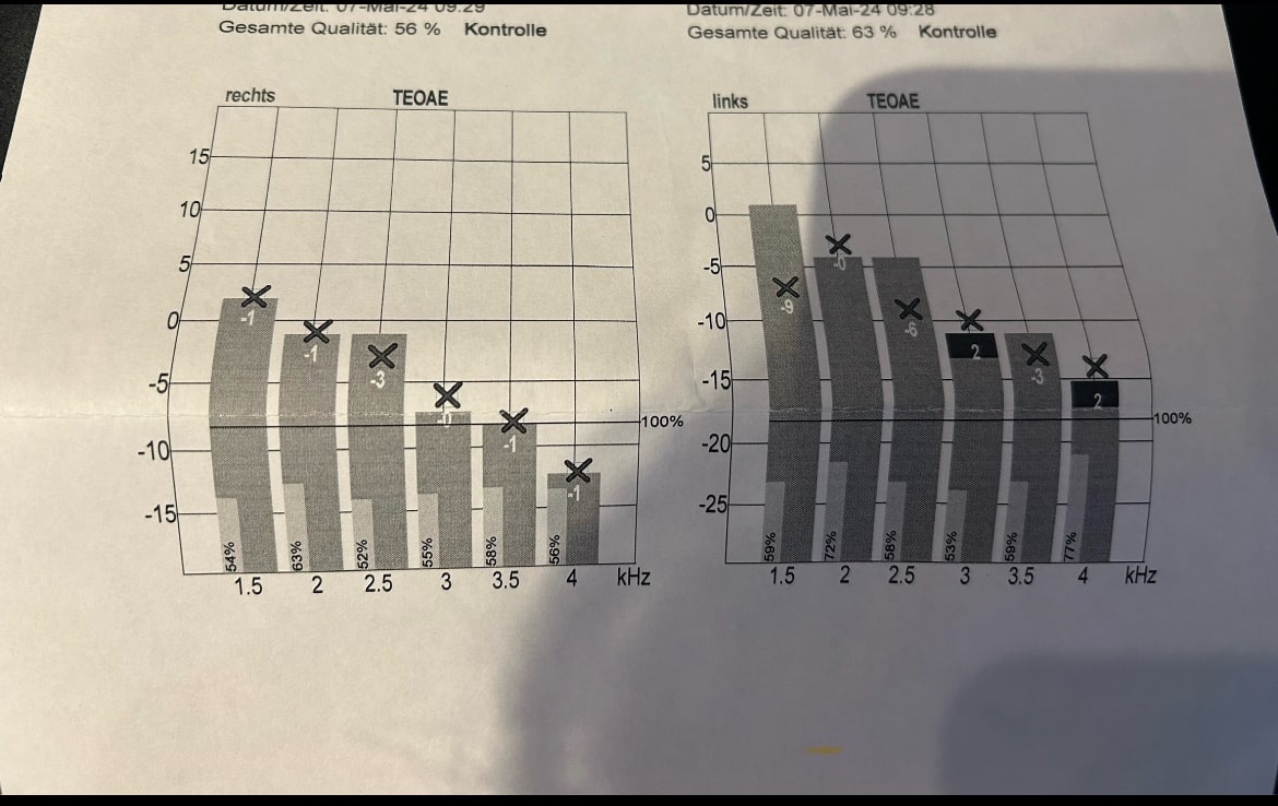 leider wird bei meinem Sohn ein beidseitiger Hörschaden vermutet. Ich habe das Ergebnis vom TEOAE beigefügt. Das ist der erste TEOAE, hier hat ein Ohr wohl noch reagiert. Beim zweiten Test dann nicht mehr. Wisst ihr wie ich diese Balken interpretieren muss? Welches Ohr könnte gemeint sein?