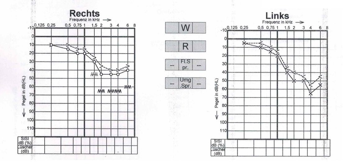 Die Diagramme unten sind das Sprachaudiogramm. Da ist die Verstehquote für einsilbige Wörter rechts bzw. links eingezeichnet. Bei 65 dB Sprachlautstärke hast du 70% verstanden, bei 80 dB 95%.