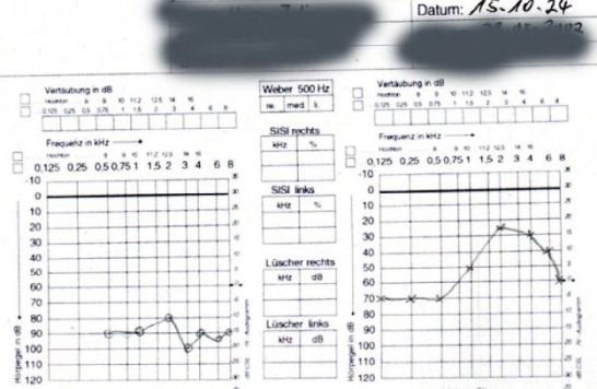 Auf dem linken Ohr hörst du die Frequenzen etwas besser als rechts und unterschiedlich. Mittlere, höhere Töne besser, ganz hohe wieder schlechter.