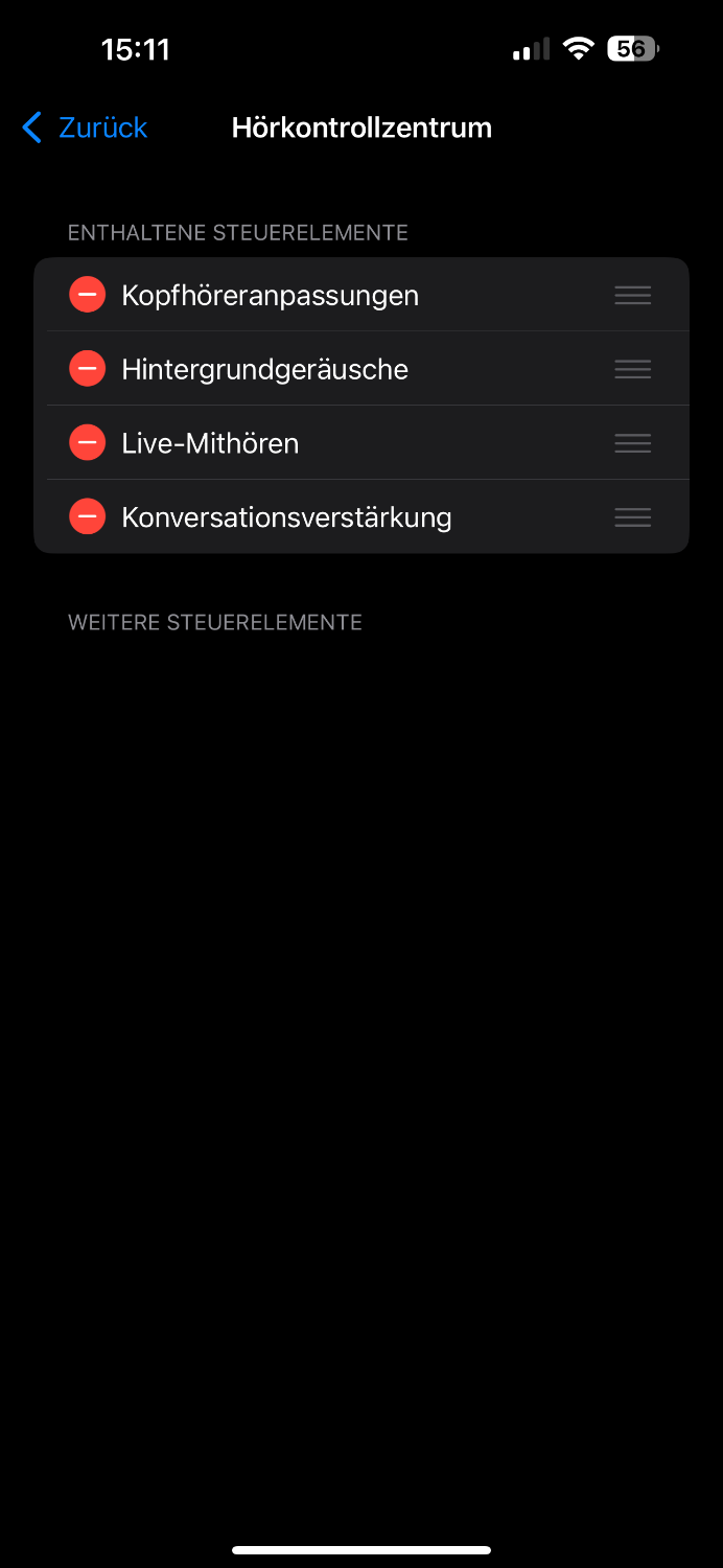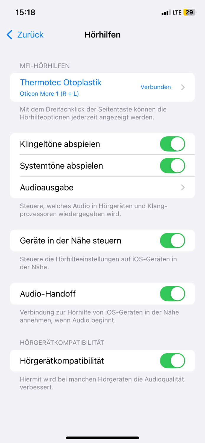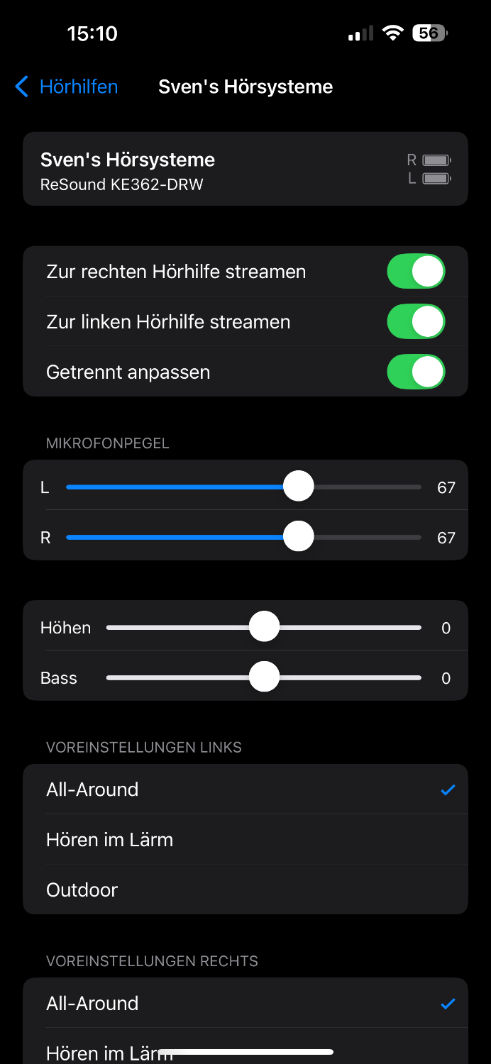 Ein Screenshot fehlte noch. Es ist wohl so, dass die Regelmöglichkeiten für MFI HG von den freigegebenen Funktionalitäten der Hörgerätehersteller abhängig sind. Insofern kann man nicht verallgemeinern, dass Apple umfangreiche Einstellmöglichkeiten grundsätzich anbietet. Diese sind scheinbar herstellerabhängig.