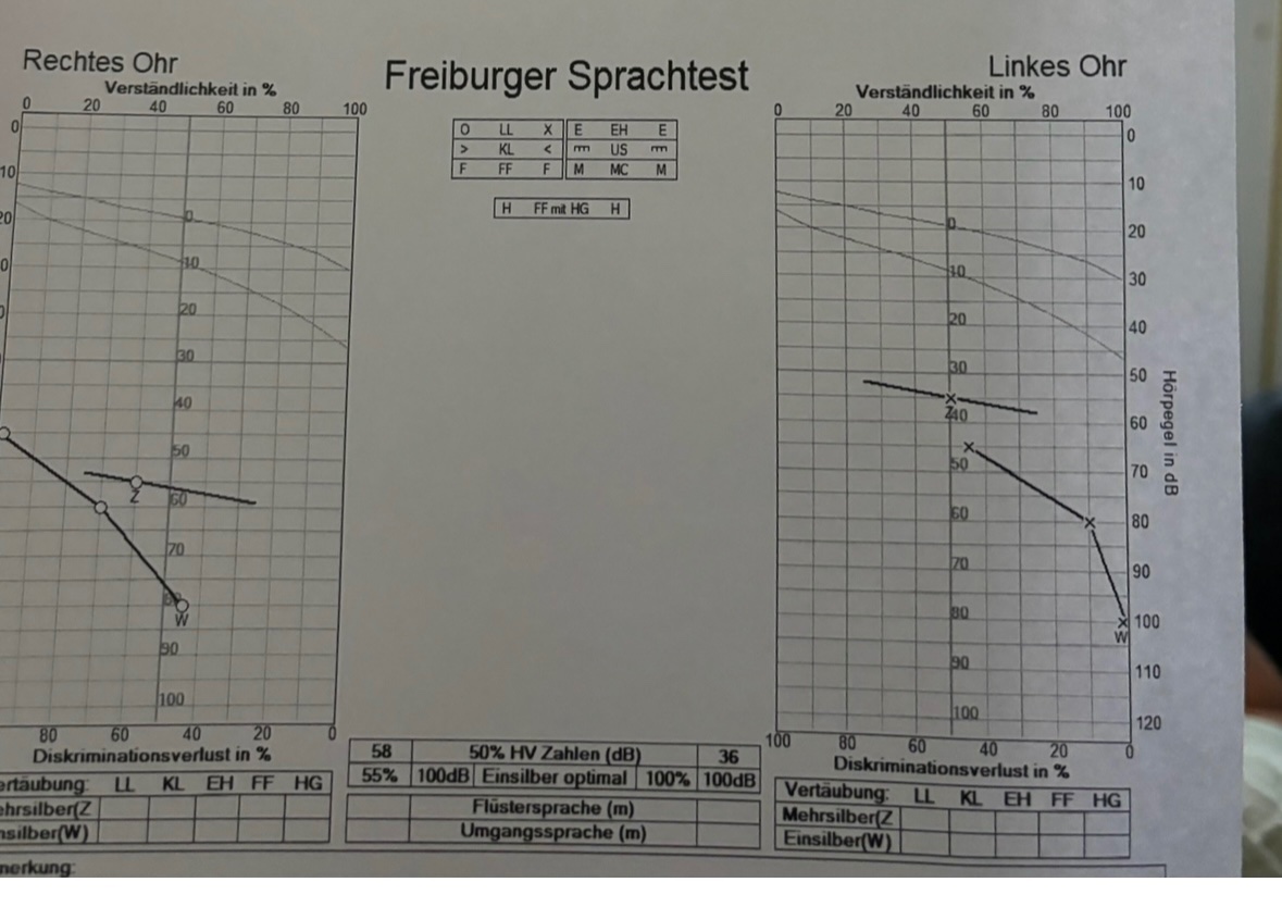 nach einem Hörsturz im Jahr 2023 mit 24 Jahren, bin ich rechts schwerhörig und habe ein Hörgerät. Anfang des Jahres durch eine Mittelohrentzündung kam mein linkes Ohr hinzu. Die Versorgung mit Hörgerät steht noch aus.