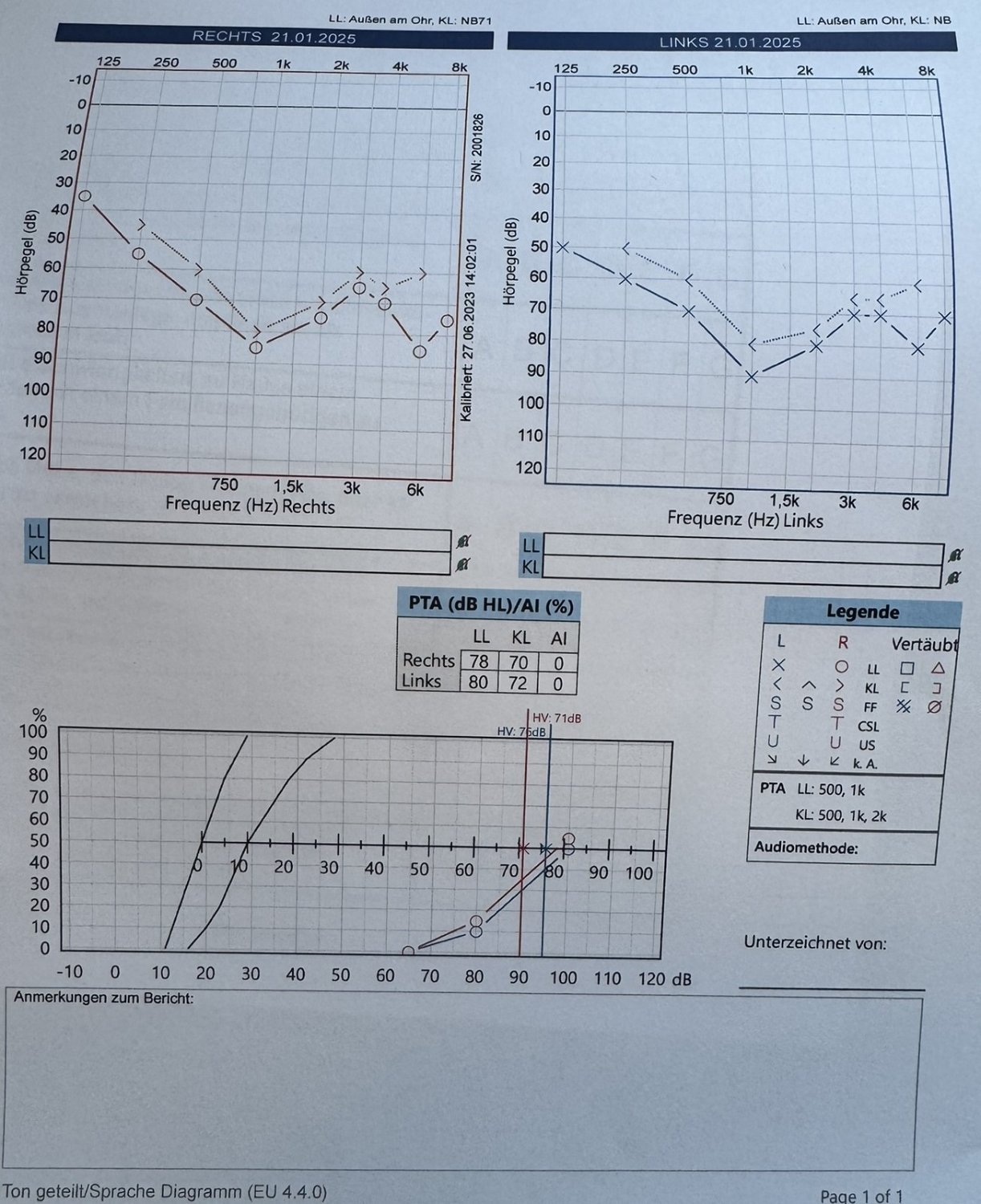 Hochgradig schwerhörig (rechts), links an Taubheit grenzend schwerhörig, Schwerhörig seit Geburt, aber Hörschädigung erst mit fünf festgestellt. Zeit Mai 2021 mit Phonak Naida Marvel 30 SP versorgt