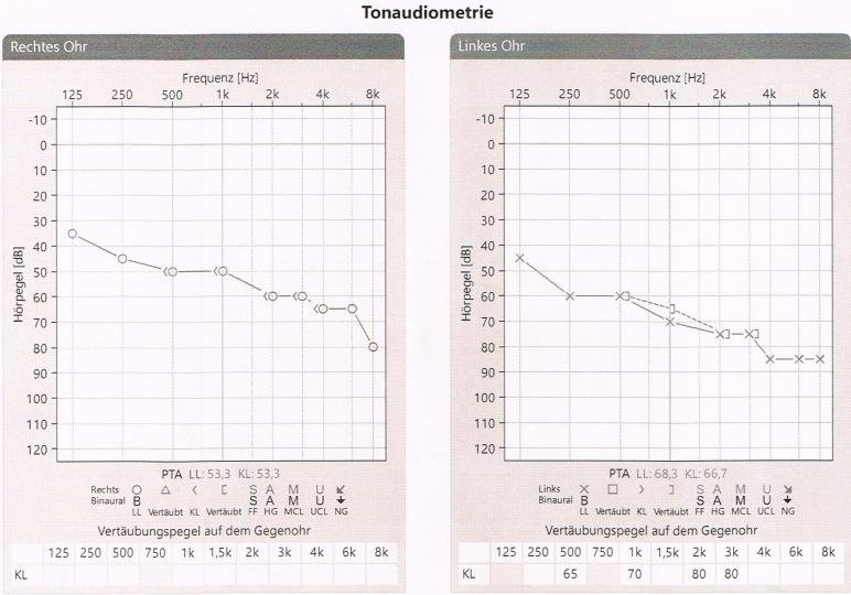 Das Tonaudiogramm wurde ohne Hörgeräte gemessen.