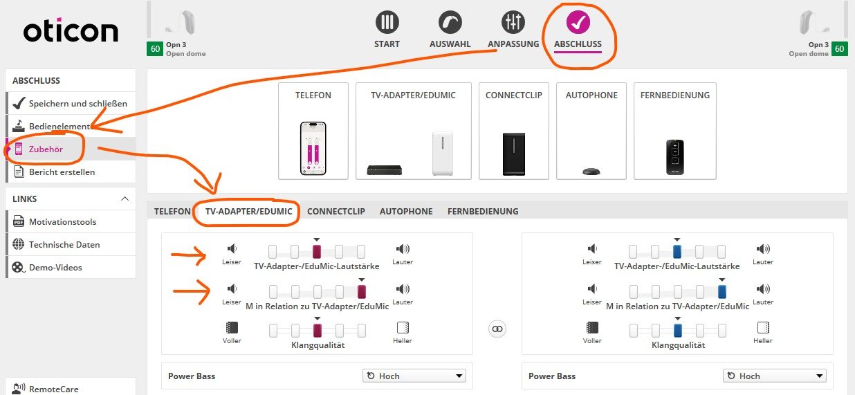Das TV-Programm/EDUMic ist der Grund, warum ich hier schreibe. Dieses Programm ist in Streaming und Umgebung eingeteilt. Das Streaming ist auf 14 voreingestellt, die Umgebung auf 0. Der Wert 0 ist gut. Ich kann noch 3 Schritte lauter und 8 Schritte leiser. Das Streaming muss ich auf 0 runterregeln. 14 Schritte. Leiser geht nicht. Die Voreinstellung 14 ist schon heftig laut. Mein Akustiker hat etwas verändert. Eine bestimmte Kurve im Bildschirm des Akustikers um einige Einheiten verändert. Dann wurde ich nach Hause geschickt, mit der Aufgabe, die neuen Einstellungen zu testen. Ich hatte meine Streamingbox dabei um das vor Ort zu testen. Das wollte der Akustiker nicht. Er hätte nicht die Möglichkeiten, die Box anzuschließen.