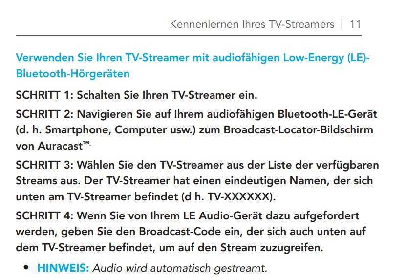 ) kann man dann die Auracast-Streams sehen und sich draufschalten. Möglicherweise braucht man ein Passwort. Falls dem so ist, steht das aber auf dem Streamer.