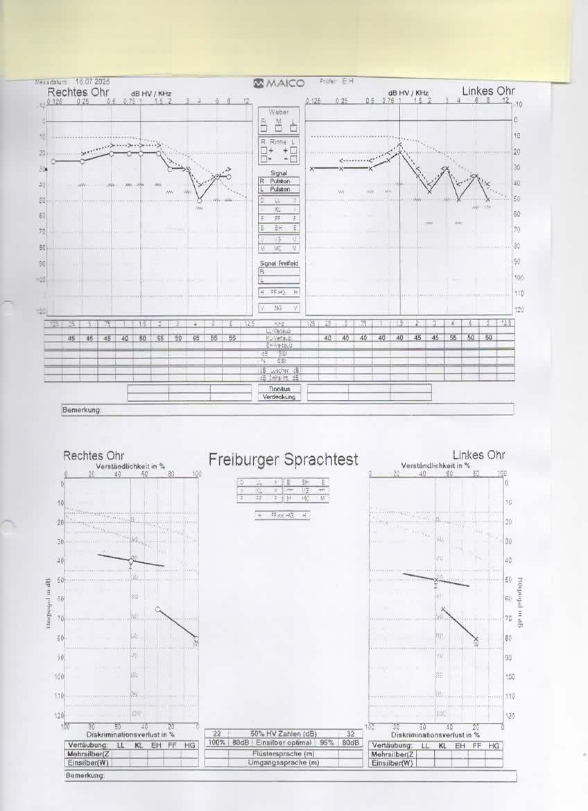 Zur Frage von "Ohrfein": Der Ohrenarzt hat den Hörfehler "festgestellt", weil ich ihn darum gebeten habe. Ich verstehe öfters als früher Sachen falsch im Gespräch, höre die Grashüpfer nicht mehr und reagiere später auf die Türklingel als andere. Das waren die Gründe für den Test.