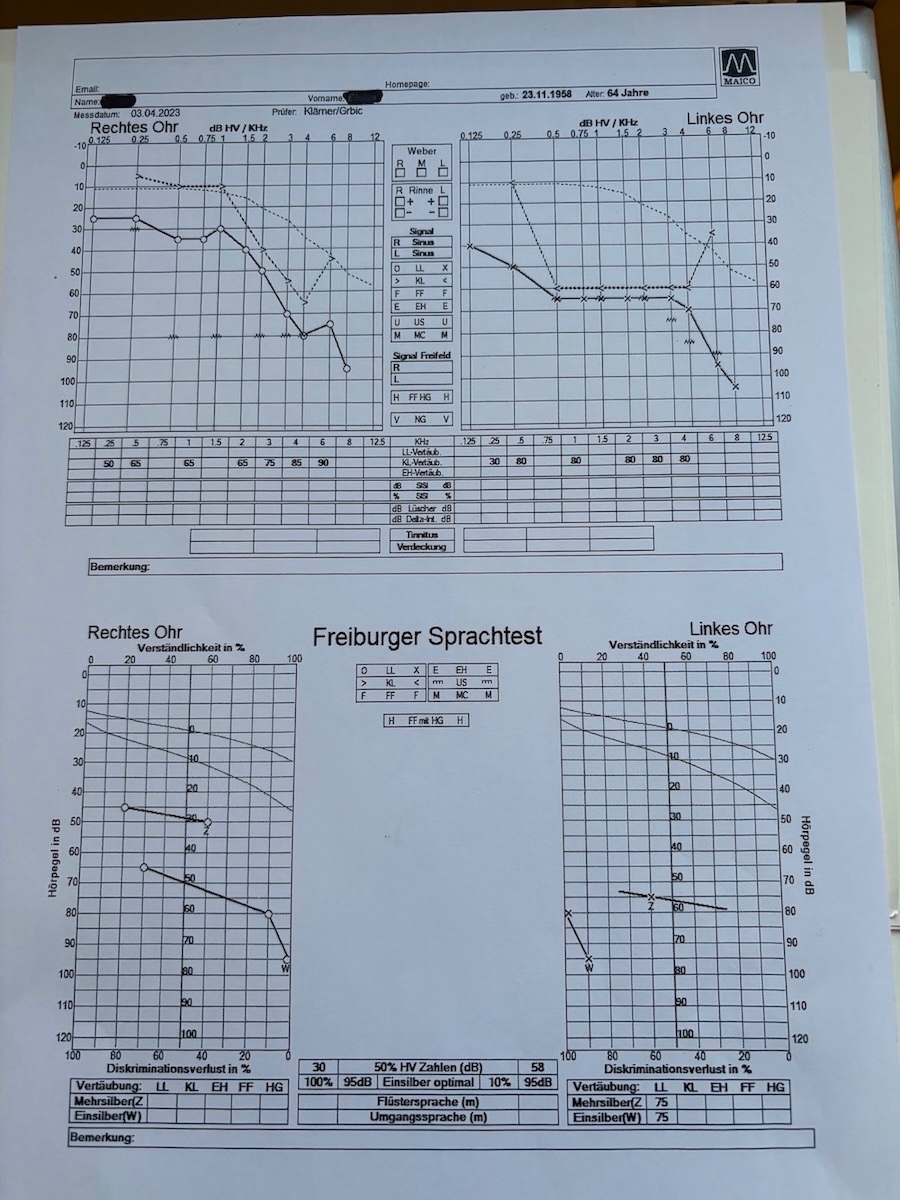 Ich hänge meinen Hör-und Sprachtest mal hier an, der allerdings nicht ganz aktuell ist. Ich vermute, es hat sich noch etwas weiter verschlechtert. Ich muss den Leuten oft schon sehr nahekommen, um sie zu verstehen ;) Die Termine bei HNO und Akustiker sind auch schon angesetzt, aber mich würde einfach interessieren, was die Profis und Erfahrenen hier so meinen, da ich die Infos und Ratschläge hier im Forum immer sehr hilfreich finde.