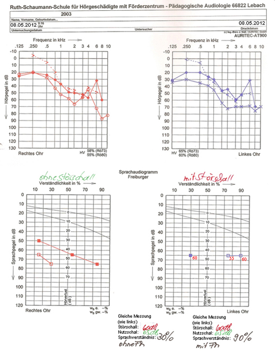 das Sprachverstehen scheint sich verschlechtert zu haben, ohne Hörgeräte. Vielleicht hat aber Deine Tochter bei dem betreffenden Test etwas weniger gut mitgemacht.