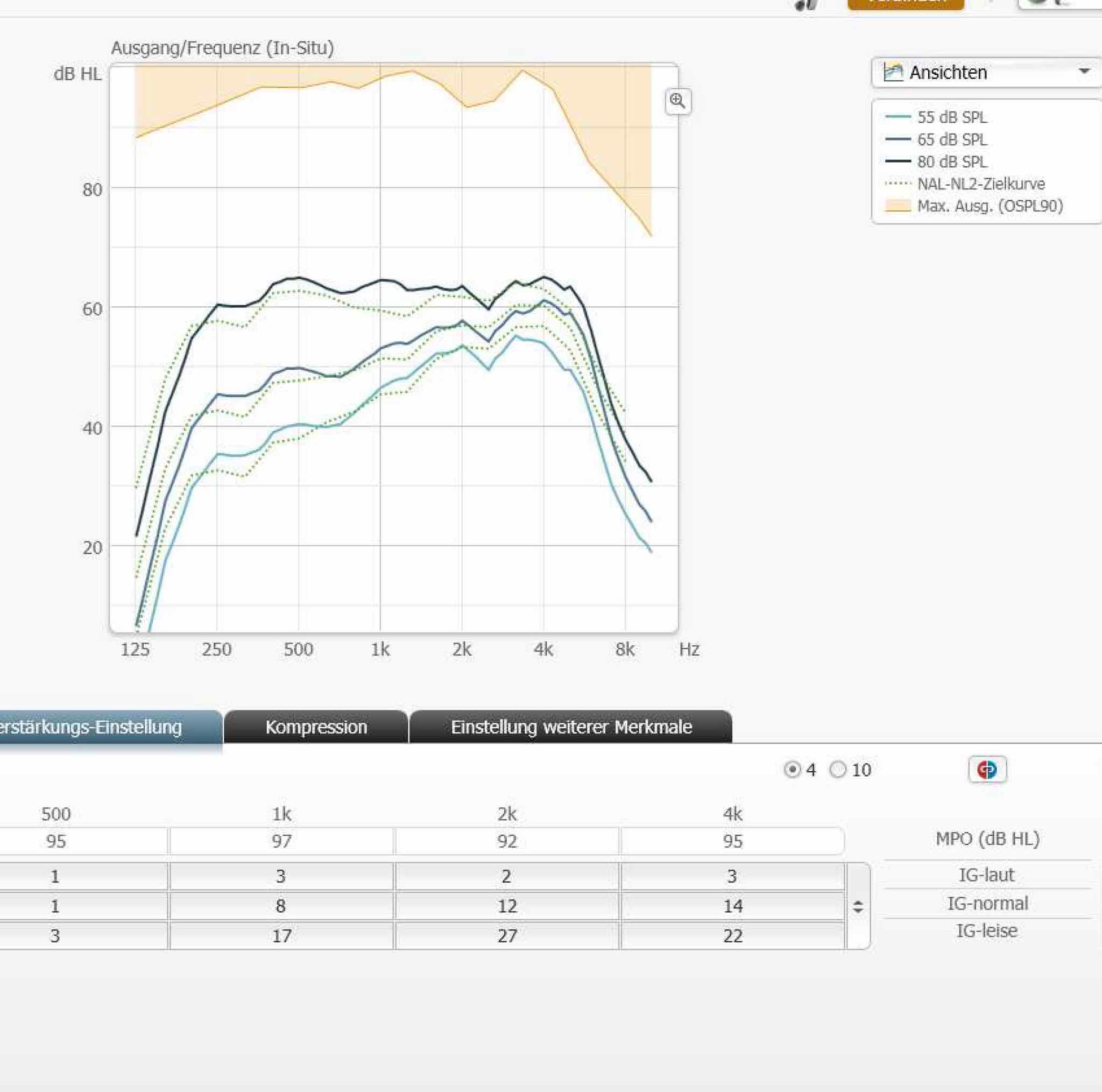 Aus diesem Grund habe ich die Einstellung auf NAL-NL2 belassen und die Kompression der lautesten Töne weniger stark eingestellt sowie die Töne unter 1K merklich abgesenkt.