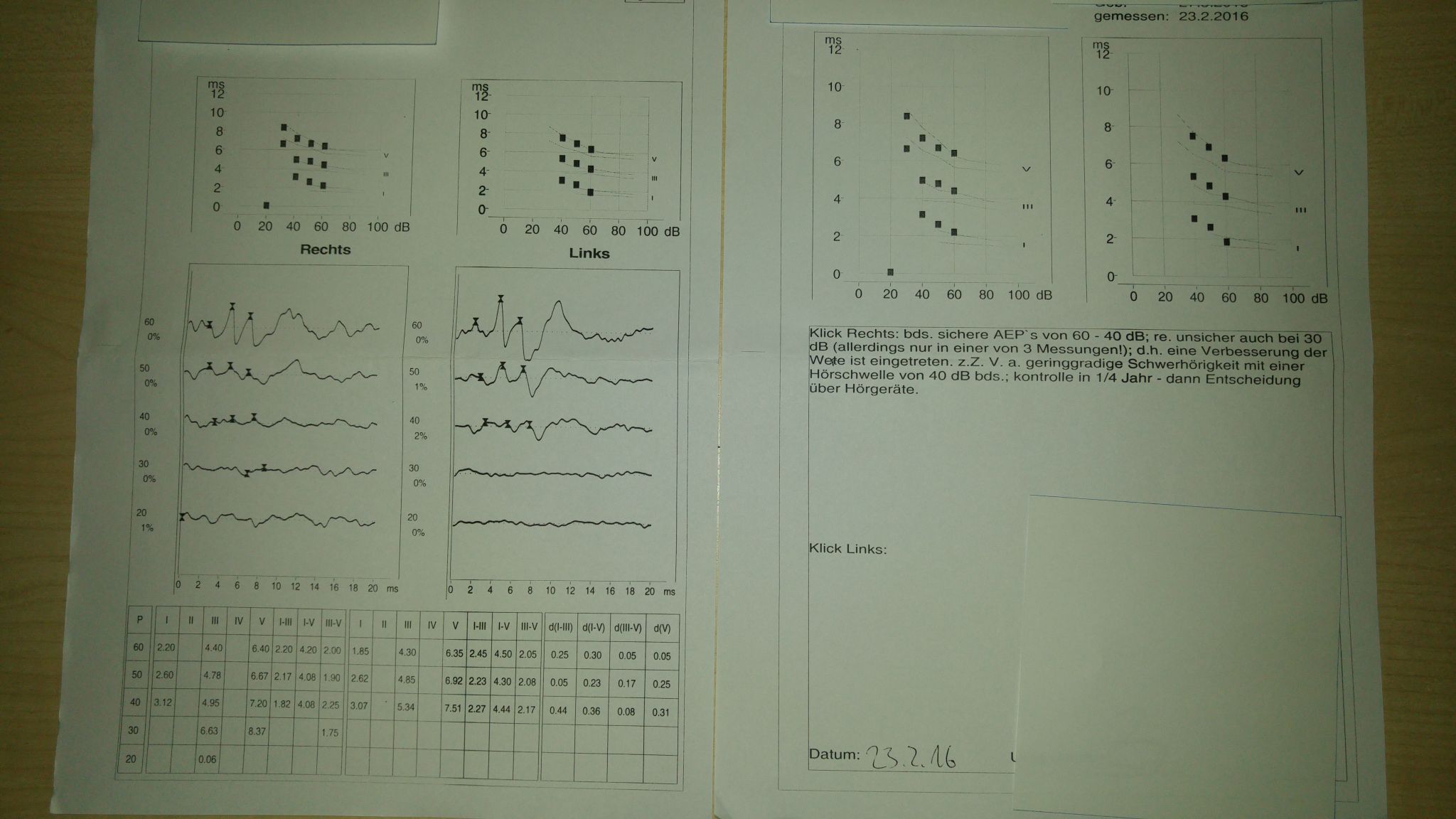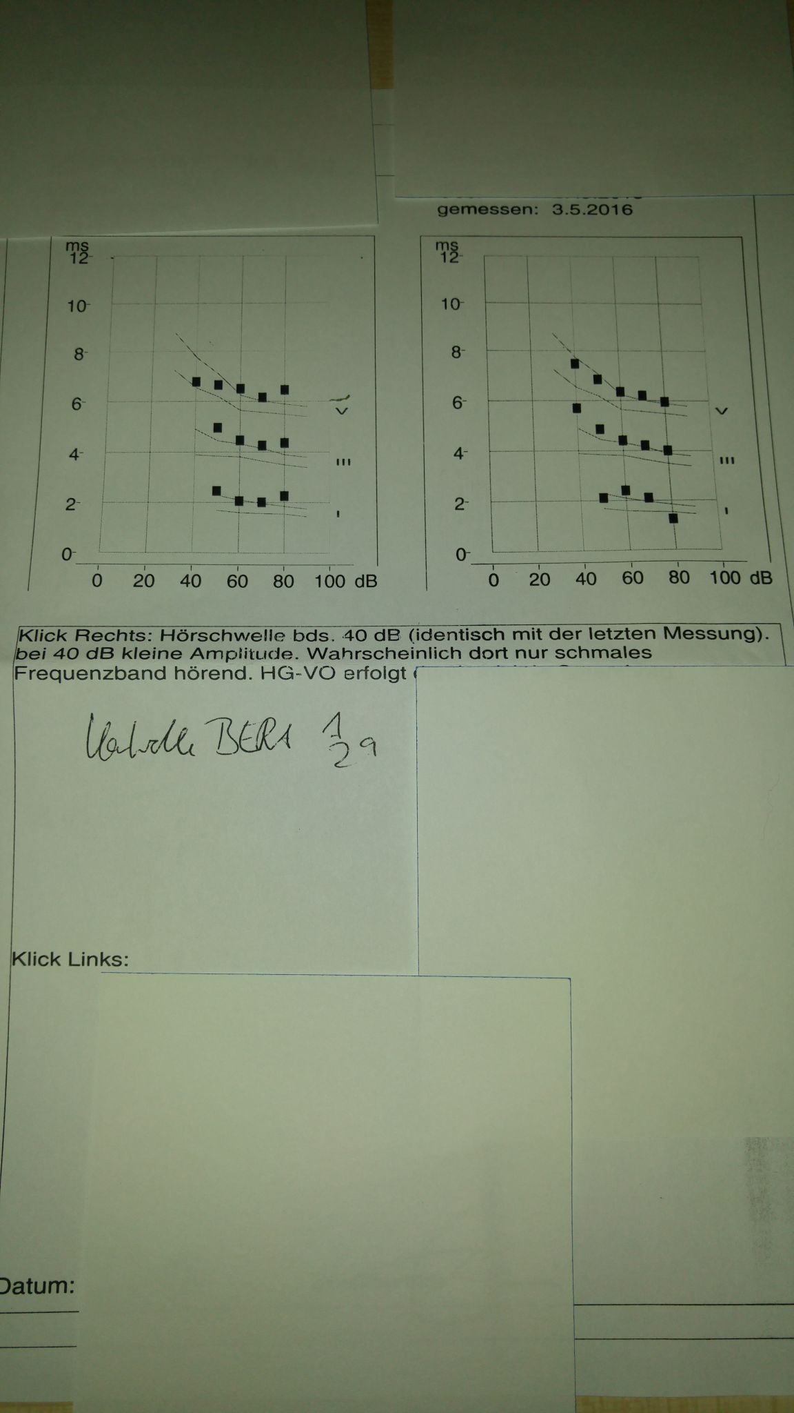 Daraufhin Kontrolle im November. Befund: reichlich Cerumen und enge Gehörgänge sonst unauffällig.Bera: sichere AEP´s bei 60 dB, mit Unsicherheit auch 50 und 40 dB, links AEP´s bei 50 dB sicher.
