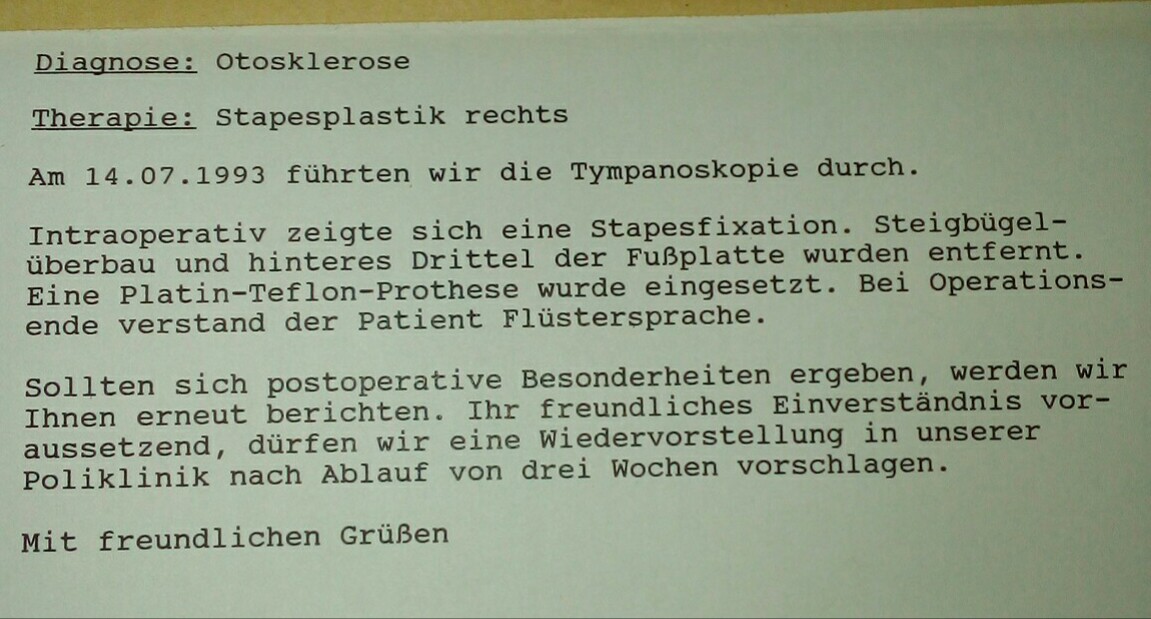 Hallo ich wurde 1993 im Ohr operiert,damals könnte ich kein Deutsch und meine Eltern haben der op zugestimmt und unterschrieben..jetzt wieder Probleme mit dem Ohr.Habe dann wegen den gdb und so alle Befunde von den Ärzten angefordert und jetzt kommt sowas ..... Diagnose:Otosklerose. Therapie stapesplastik rchts ...am14.07.1993 führten wir die tympanoskopie durch.Intraoperativ zeigte sich eine stapesfixation.S Steigbügelüberbau und hinteres Drittel der fußplatte wurden entfernt.Eine Platin Teflon Prothese wurde eingesetzt.bei operationsende Verstand der Patient flüstersprache....also da habe ich mal angeschrieben....und jetzt erfahre ich erst das ich irgendetwas da drinnen habe ...was geht da jetzt eigentlich ab mit meinen Ohr