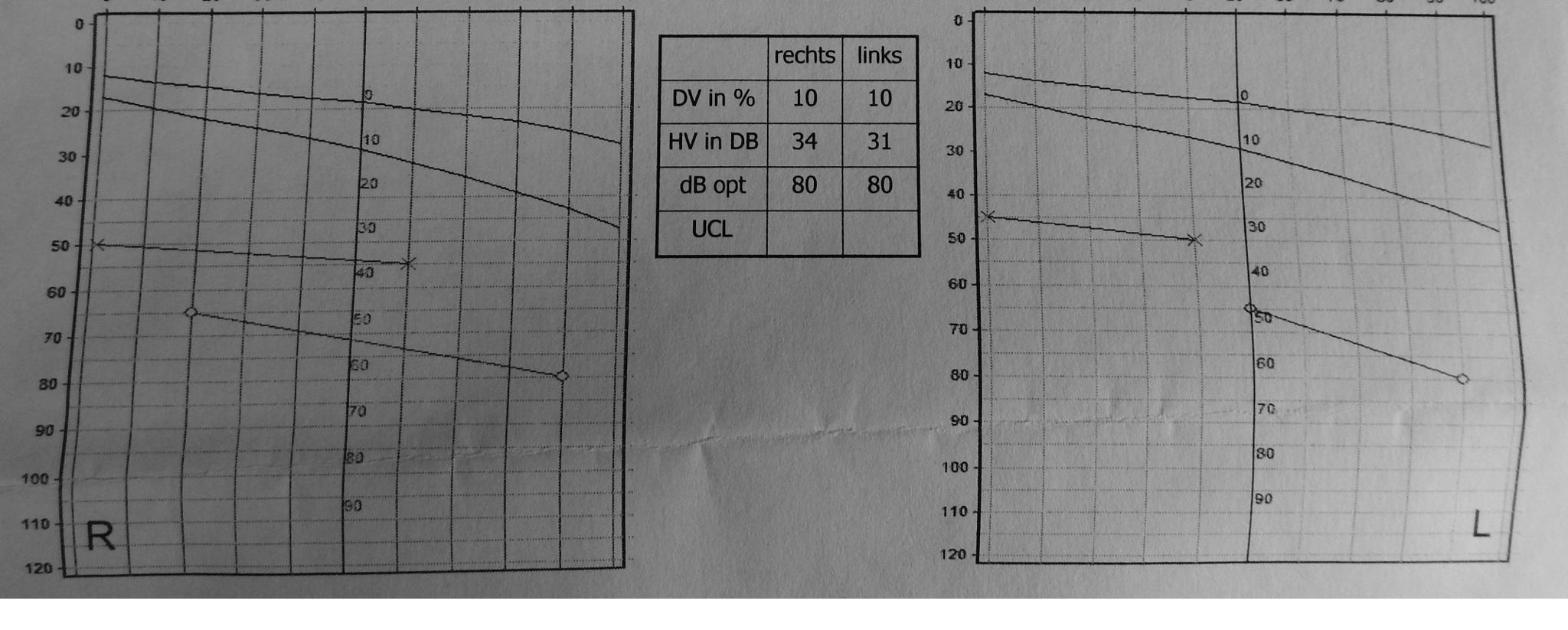 Das Einsilberverständnis beträgt bei 65 dB rechts 20 % und links 50 %