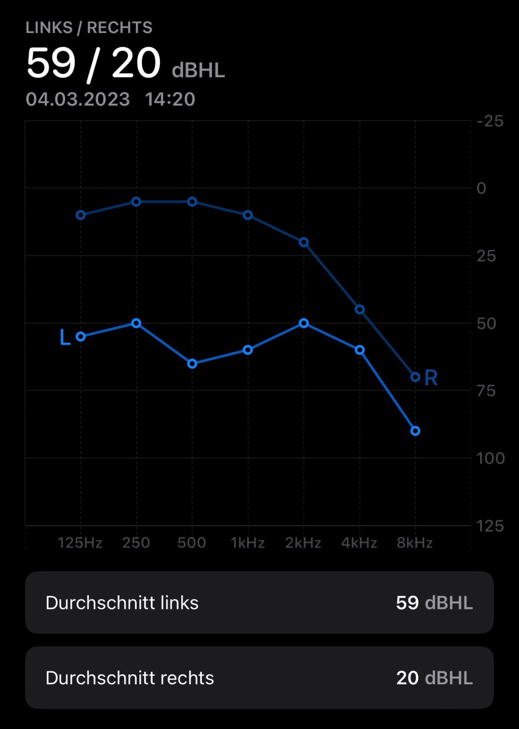 Da ich links ja sehr wenig höre, gehe ich davon aus, dass der Effekt des Audiogramms in erster Linie rechts durchschlägt, wo ich ja auch etwas eingeschränkt höre.