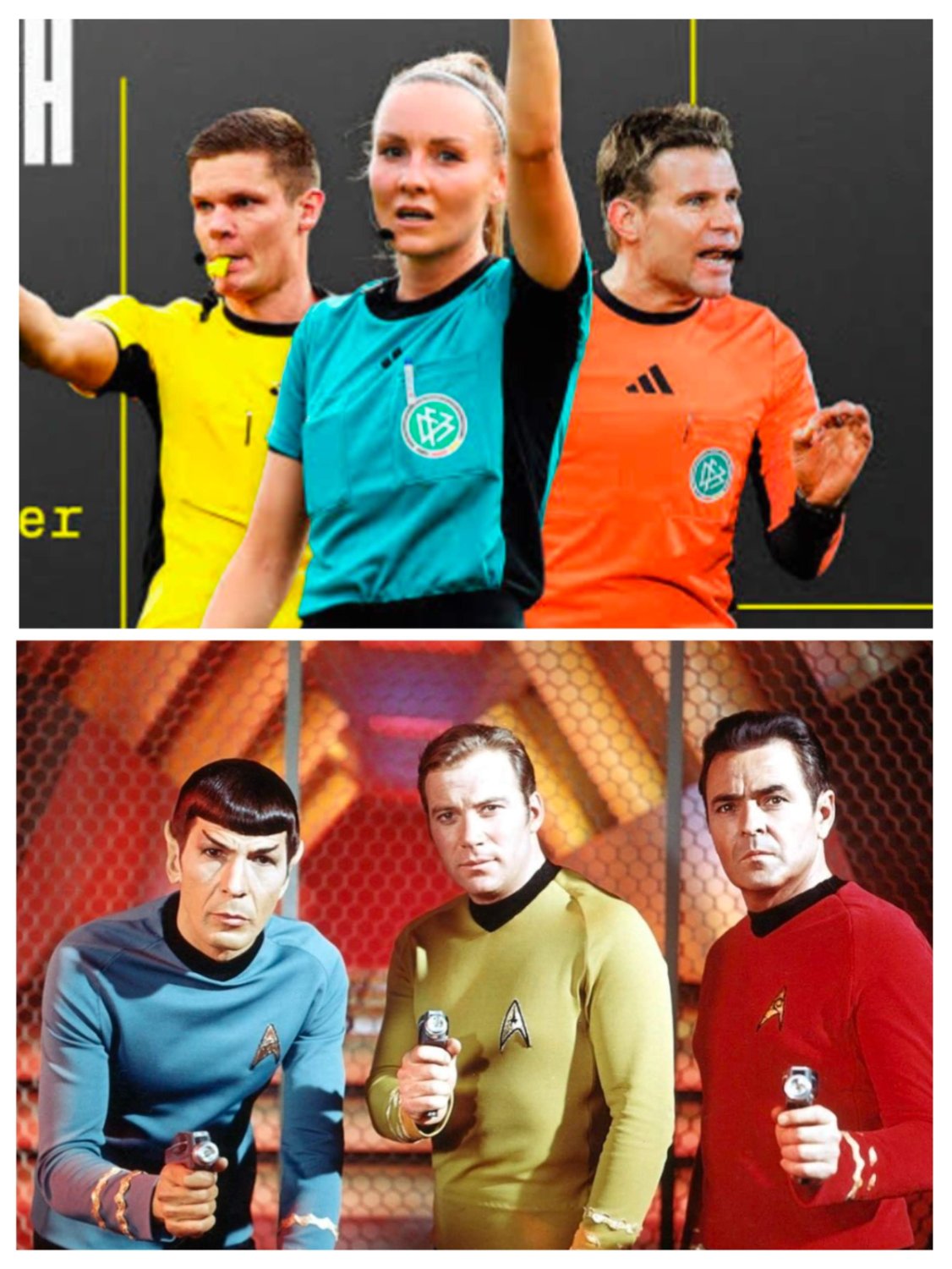 Die Trikotfarben von Fußball-Schiedsrichtern haben die gleichen Farben wie die Uniformen auf der alten Enterprise.